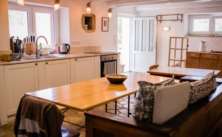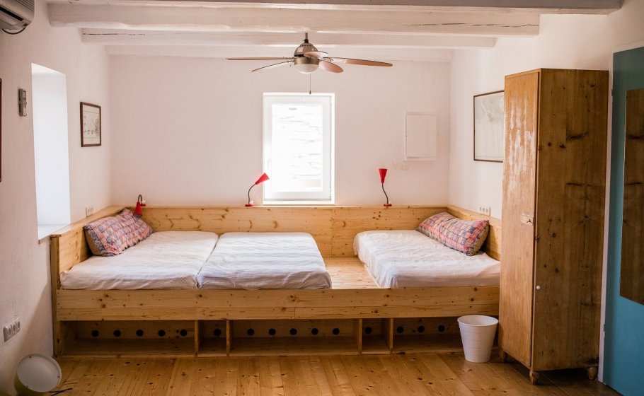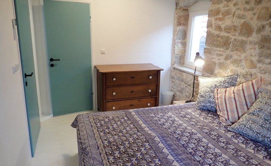 This floor is the house’s common area and a meeting place for meals. It’s paved in rough local stone, and has a picnic table like the two in the courtyard, as well as an old Bohemian farm bench, a smaller table, and some mobile folding seats from an old Prague cinema. The style can best be called country-flexible funky or maybe just "we-have-no-design-sense-whatsoever." There are way too many types of wood on the ground floor, including refinished 1950’s Bohemian kitchen cabinets mixed with Ikea benches. The only chic elements on the ground floor are the brown paper shades on the countertop lights, made by owner's 80 year-old mother. The kitchen counters are natural Brač stone (Pertinent Trivia Point: the same stone used in the White House in Washington, DC), 300-guage stainless with end-grain maple butcher block (do not use the kitchen butcher block for fresh fish please), and there are plenty of pots & pans, plates, glasses and utensils stowed away behind the large sliding panels. Owner is very sorry for the mismatched glasses and preserve jars, as he is aware that they’re a tired hipster cliché. The kitchen has a dishwasher, electric hobs, a stove and microwave, a countertop blender that makes great crushed ice drinks, a wine fridge, and a large under-counter freezer. There is also a separate countertop ice maker, an immersion blender and a Cuisinart, and I’m pretty sure there’s an ice-cream maker around somewhere, a pasta-making thingamajig, as well as lots of forms for home-made popsicles that the kids love. Here you will find all the kit that you’ll need for good coffee, whether stove-top Bialetti or pour-over, as well as a Hario kettle, a scale and an antique grinder. There is a washer and a dryer … though we rarely use the latter, since besides the energy saved, there’s nothing quite like sun-kissed and wind-dried laundry. (There’s a second washer in the attic flat if you need the extra capacity.) There’s also a large sink with an astoundingly poorly located faucet and a full bathroom with a tub, used mostly by whoever’s staying on the first floor. Owner left the big sliding panels natural wood for now, because he hasn’t been able to make up his mind if he should paint them white like the cabinet doors, blue like the room doors, black like the wrought iron, or leave them natural … and he will be grateful for your input to break the impasse. There’s a wobbly ceiling fan and a not wobbly air-conditioning unit. What there is not, however, is an in-sink waste disposer, so please don’t dump anything down the sink drains that you don’t want to be wading in later, as feedback from plugging up the grey-water pipe to the septic tank is merciless and quick … and that goes for flushing anything other than toilet paper down the toilet too, as our little cutesy-pootsie signs hopefully make clear. Please also don’t wear shoes above the first floor, and leave them on the landing or the ground floor. Another thing cottage does not have is an extractor hood, partly because the aforementioned cooktop is located between a door and a window, but mostly because the hole in the thick stone wall just above the cooktop turns out to be too low. But you’ll be fine with an open window and door.