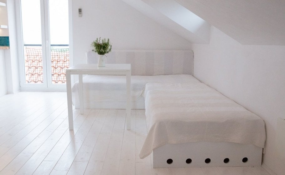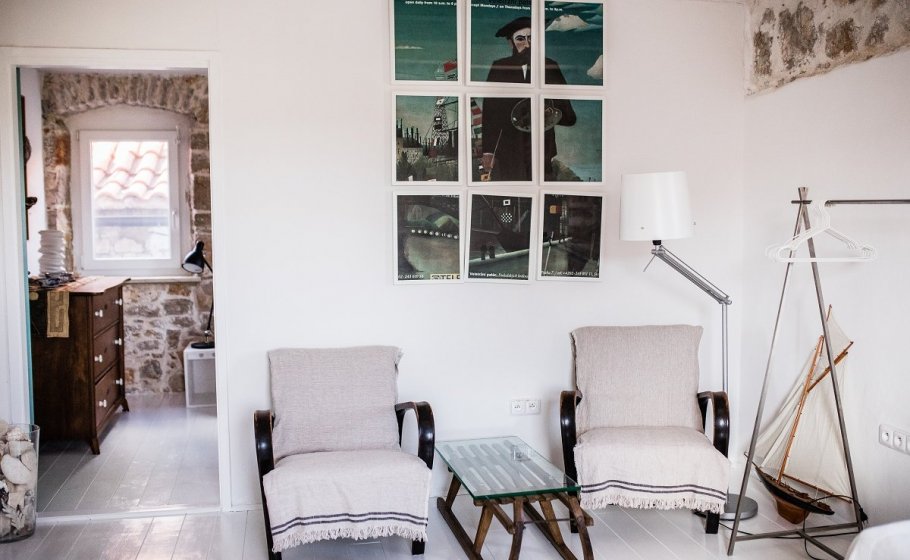 The second floor is more adult and done in a hopefully more chic adult style than the first floor, with white wooden floors and adult art on the walls. (No, no the kind of adult art you’re thinking about.) It includes a bathroom with a large walk-in shower enclosure tiled in Brac stone and has a double sink. It has two bedrooms: One has a king-sized bed made from two separate mattresses. (All the mattresses in the house are 90 x 200 cm. It makes buying sheets and soft furnishings a heck of a lot easier.) This bedroom has direct access to the bathroom. The other bedroom has two single beds, albeit they could be pushed together if you need some nocturnal closeness, and it has access to the same bathroom as the other via the second-floor landing. The white-washed pine flooring from this floor on up is sensitive to both dirt and scuffs, so we usually walk in bare feet. There’s also a reading lamp and some antique upholstered chairs, a stylish rack made to our design for hanging clothes, an old poplar chest from the 1800’s, and a coffee table made from an antique sled - wildly out of place on a warm Mediterranean island.