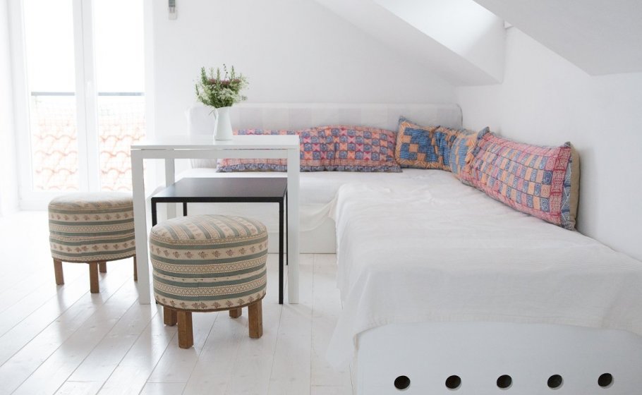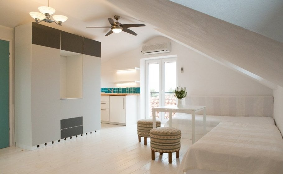 The "penthouse" floor is more self-contained than the others, and has the only lockable inside door in the house (other than the bathrooms, of course). It’s where the owner stays when he is in the house, and it's his favourite floor, where the whole family can be together in one big room. This floow has a second kitchen with a massive beechwood countertop and undershelf LED lighting. The bed platform is lit by Artemide Tolomeo articulated lamps, and is designed to sleep three in close proximity or two with a lot of extra space. There’s also a sofa-cum-additional sleeping area for two with a large and motley collection of pillows, including Zimbabwe wax prints that you’ll find a lot of throughout the house. There’s a second washing machine on this floor, and an elegant but small bathroom, also tiled in Brač stone, with an overhead rain showerhead that splashes way too much and will be way too low for Andre the Giant. The attic flat has the previously mentioned incredible views: you can see over to Brač island, to the morning sun in the east, and over Stari Grad bay to the setting sun in the west. The little fridge is perfect to keep your sundowner ingredients chilled and there’s a well-curated if dated iPod on an Apple sound-dock. You can make a little breakfast on the cooktop before coming downstairs to join the rest of the gang, but - if you want - you can cook a full meal up here too. There are a couple of low tables, two upholstered stools that one grandmother used to have in her Prague boudoir, a Cameroonian 5-legged stool, and it’s all lit by a 50’s light fixture between the two modern ceiling fans to keep things dissonant.
