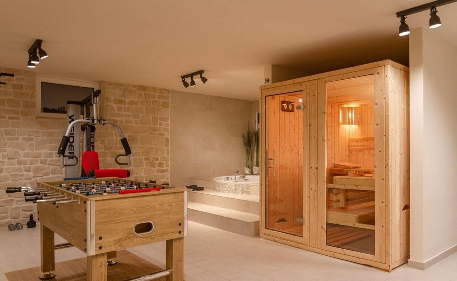 In both villas, the underground is the zone reserved for relaxing. It consists of a fitness area, sauna (planned for 2017), Jacuzzi, and a game room. There you will also find a small wine cellar located on a stone wall, where you can enjoy in some of the best Croatian wines. Nazdravlje!