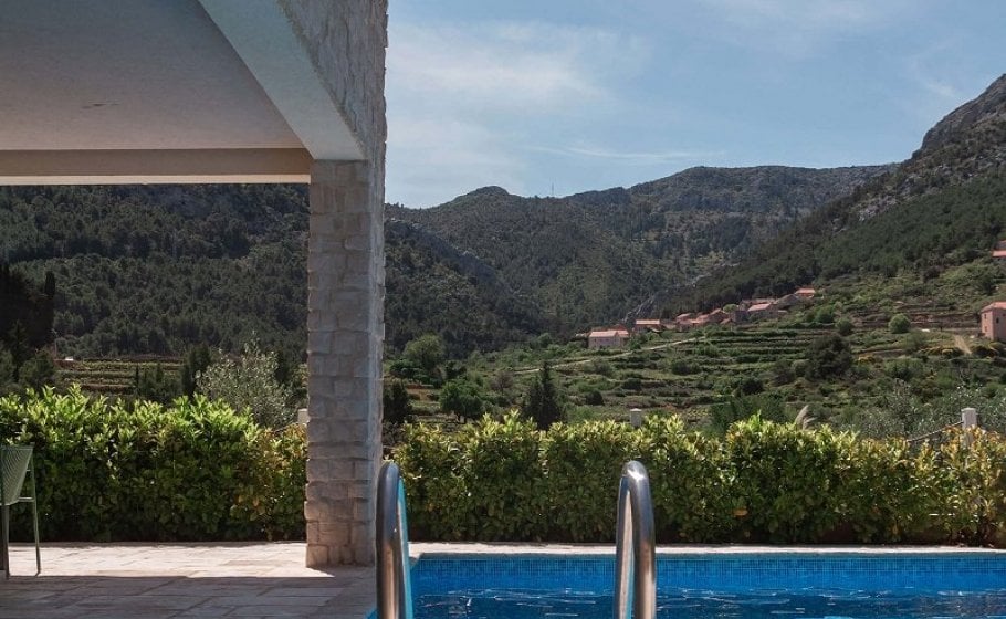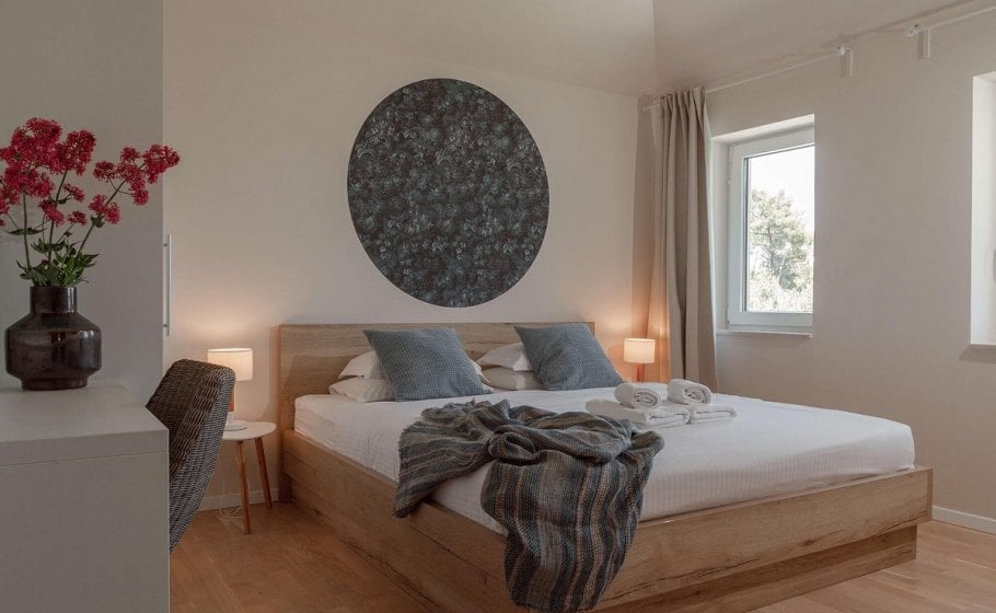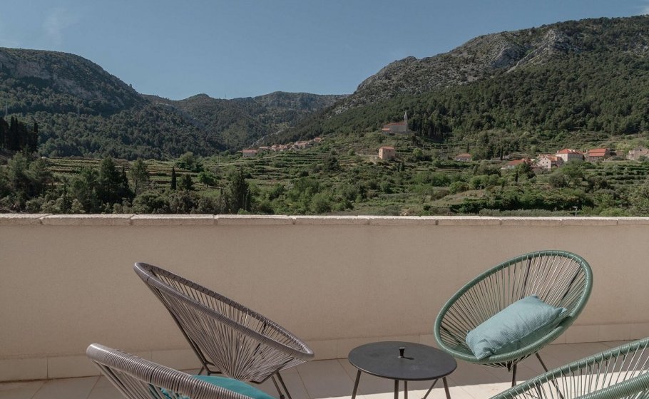 In Villa Adrasteia, two master bedrooms have a magnificent view from their already mentioned balcony of 40 m2 over the picturesque village of Pitve, the town of Jelsa, hills, forest, and the sea.