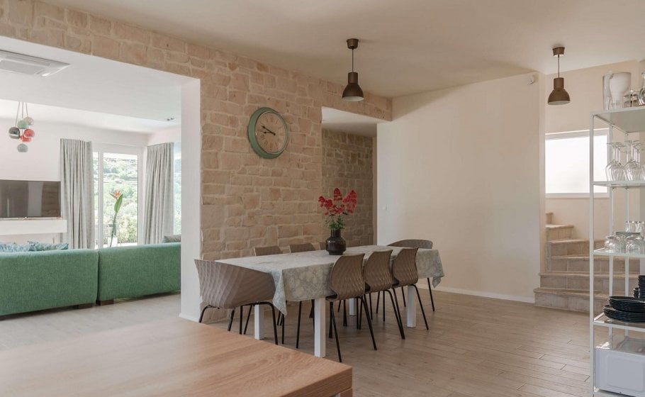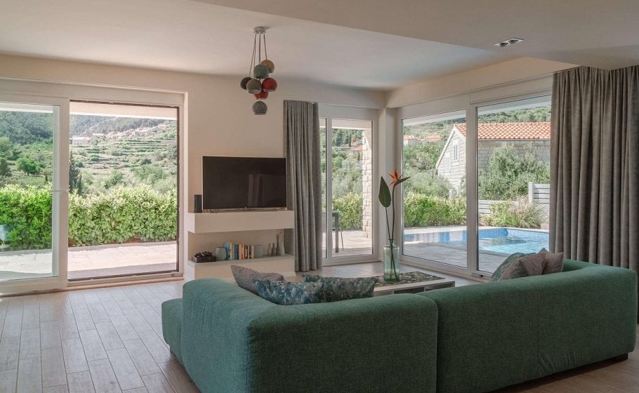 On floor zero there is an open plan kitchen/dining/living room area. The kitchen is fully equipped, the dining area has a dining table for eight people, and it is placed between the kitchen and the living room which has a TV and sofa for eight people. The entire area of the living room/kitchen/dining room is airy and bright as it is on all sides covered with glass walls (three pairs of large sliding glass doors) through which you can enjoy the view of a beautiful and spacious garden the size of 150 m2, terrace, lawn, and greenery which surrounds the villas. The pool area has an amazing view of the village of Pitve and the town of Jelsa. Of course, Adrasteia has a different kind of view since it is located in front of Echo, but Echo is located at a somewhat higher altitude. As it is in life, it seems that neither of them has everything; but each has something!
