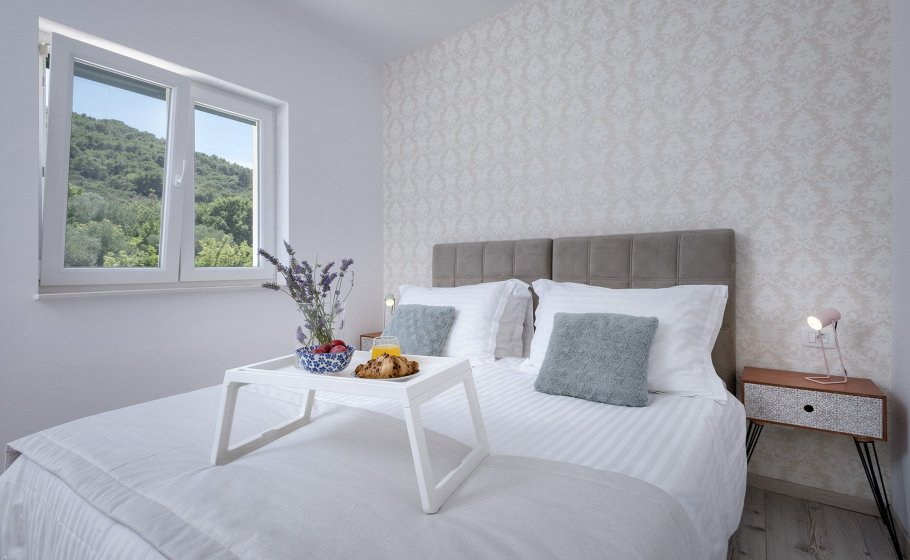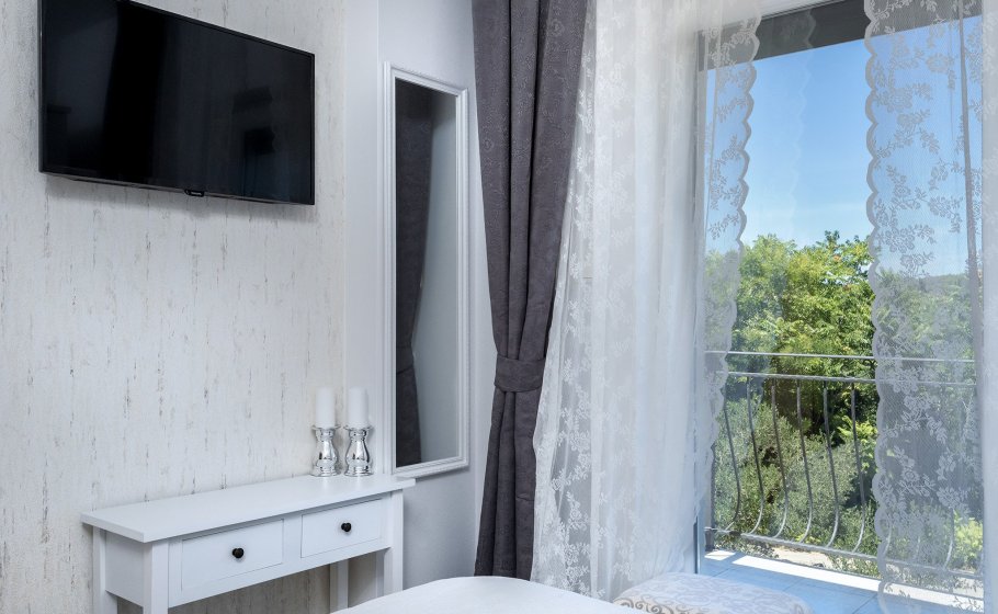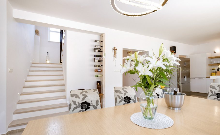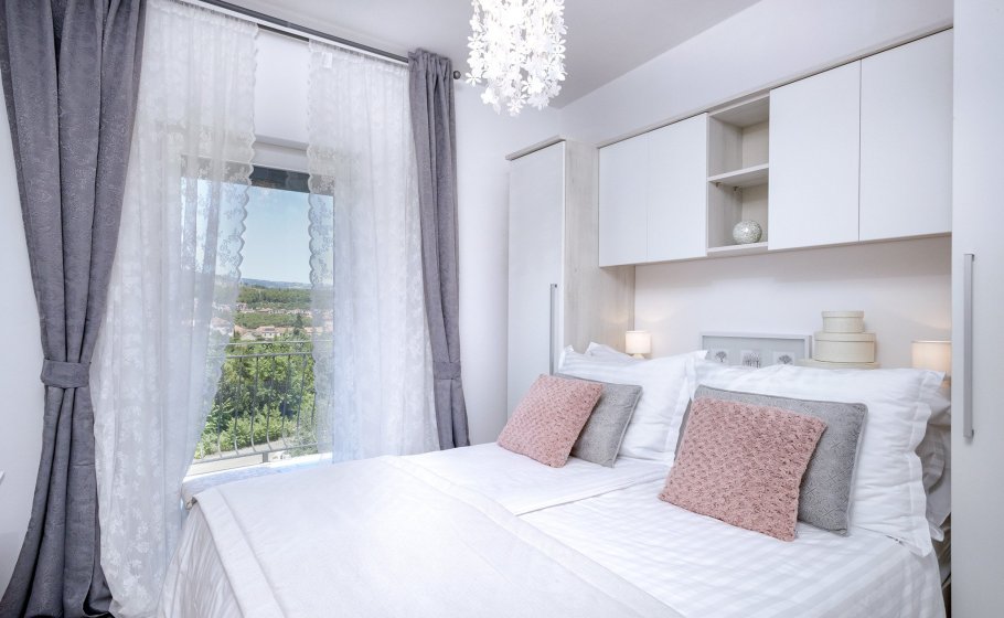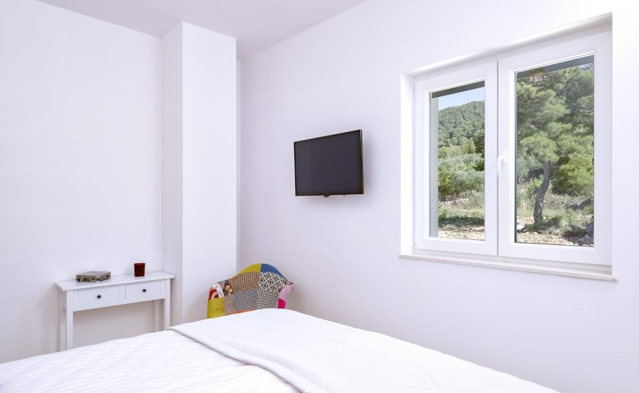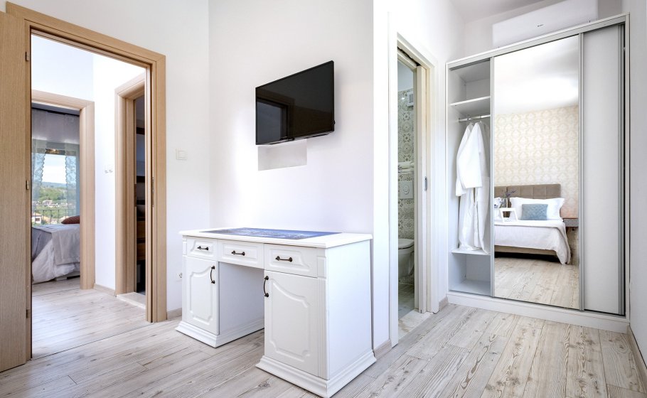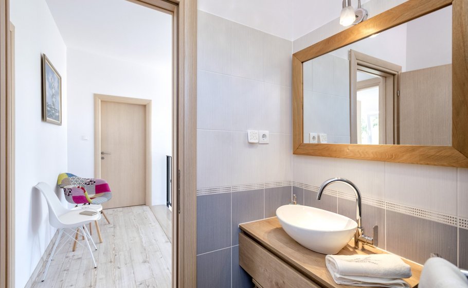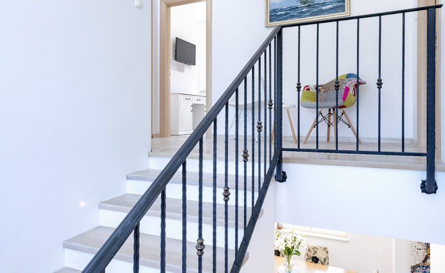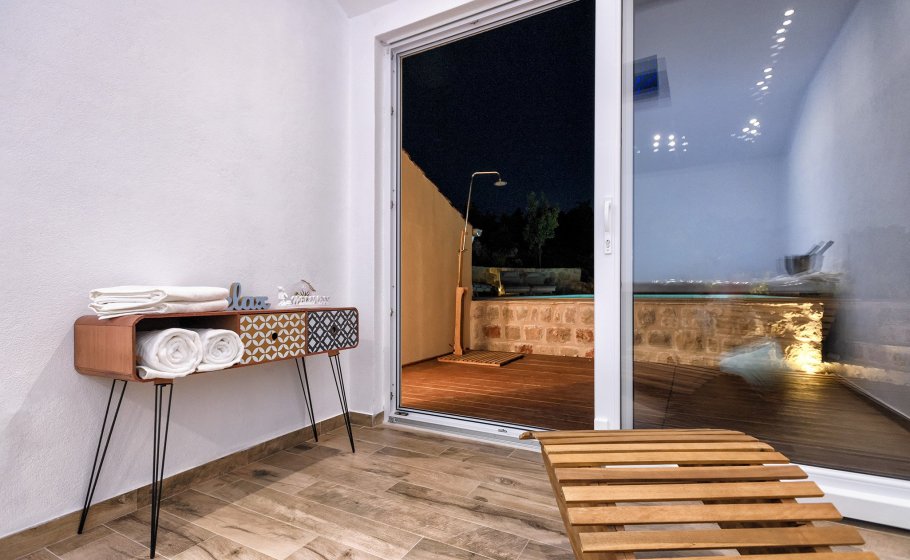 Let’s now go back to the dining room/living room area. Twenty or so steps lead you from this area to the first floor of the house. From the anteroom, you can enter three double bedrooms with matrimonial beds and en-suite bathrooms. Two of the rooms have shower trays, the third has a shower tray and a jacuzzi bathtub. Also, one bedroom has a balcony overlooking Stari Grad, whereas the other two have windows overlooking the garden with the pool.