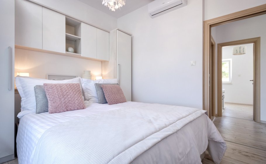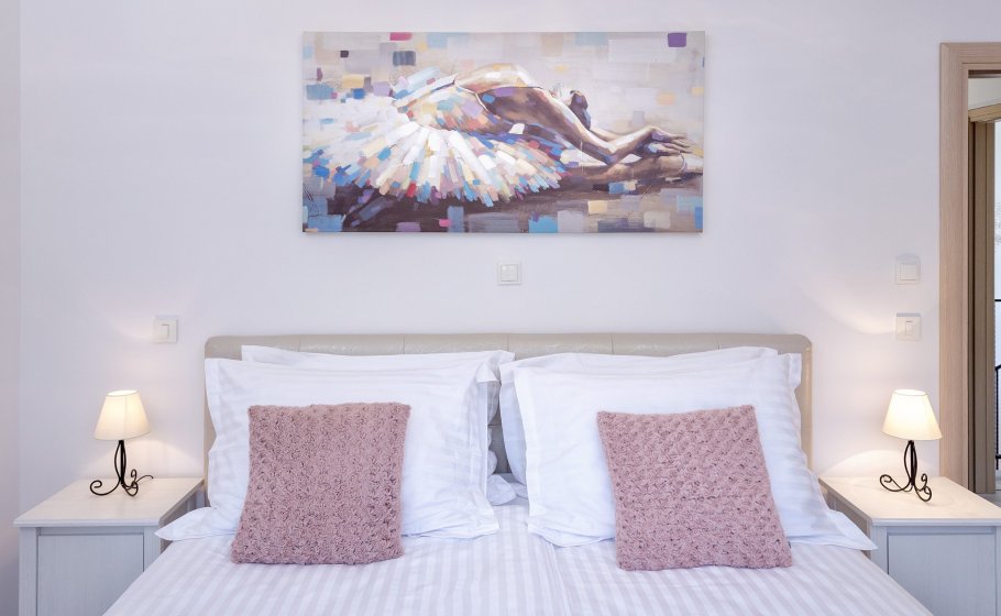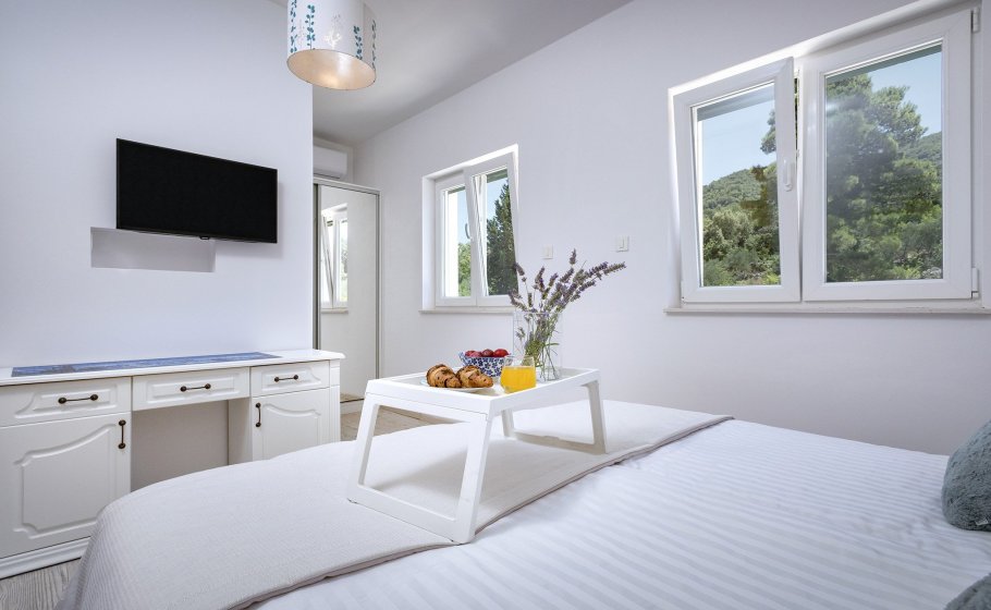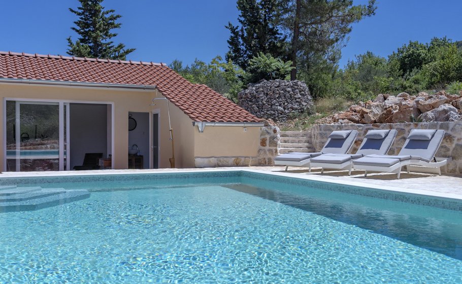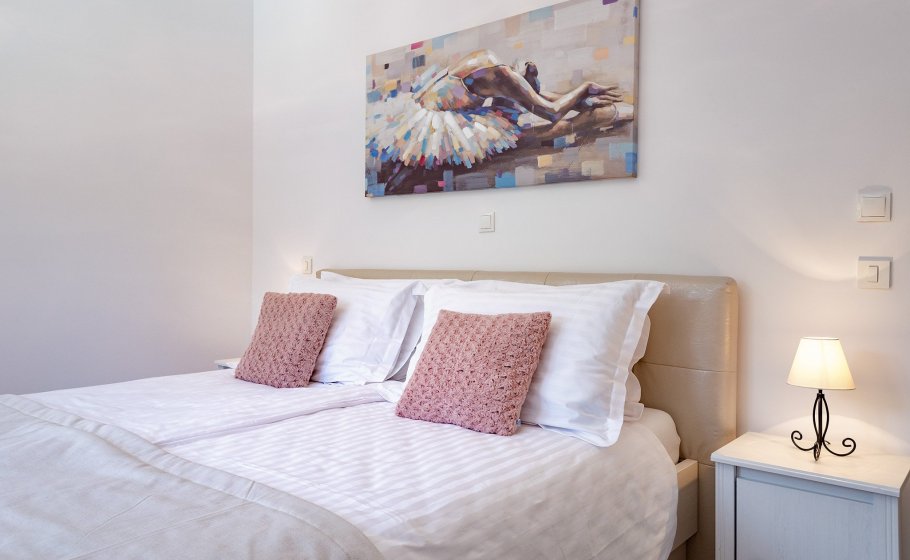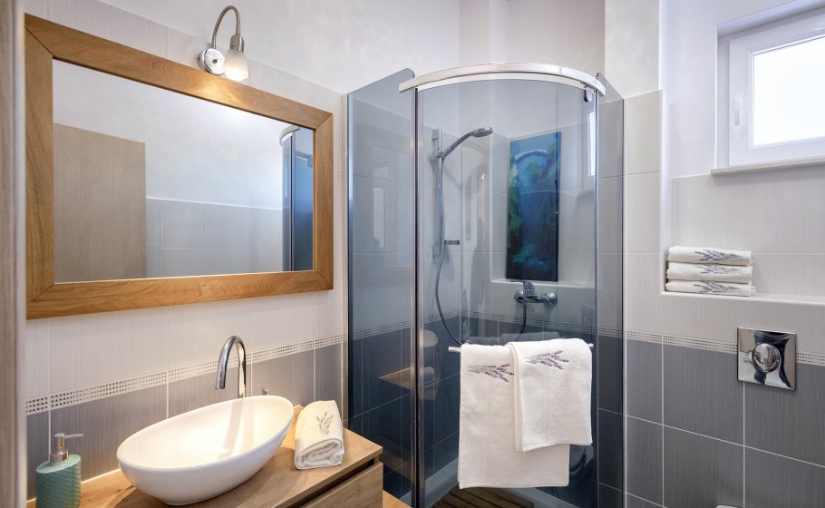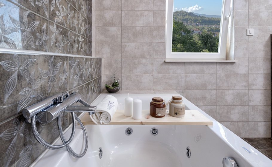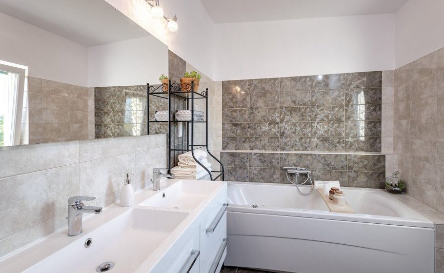 Let’s now go back to the dining room/living room area. Twenty or so steps lead you from this area to the first floor of the house. From the anteroom, you can enter three double bedrooms with matrimonial beds and en-suite bathrooms. Two of the rooms have shower trays, the third has a shower tray and a jacuzzi bathtub. Also, one bedroom has a balcony overlooking Stari Grad, whereas the other two have windows overlooking the garden with the pool.