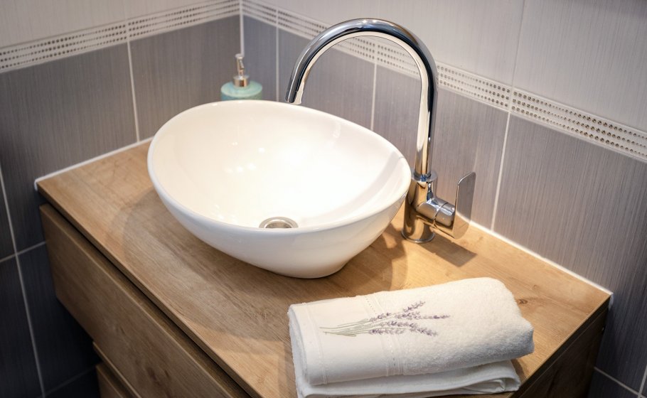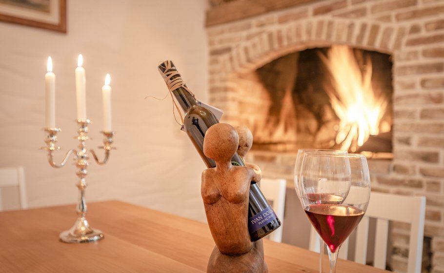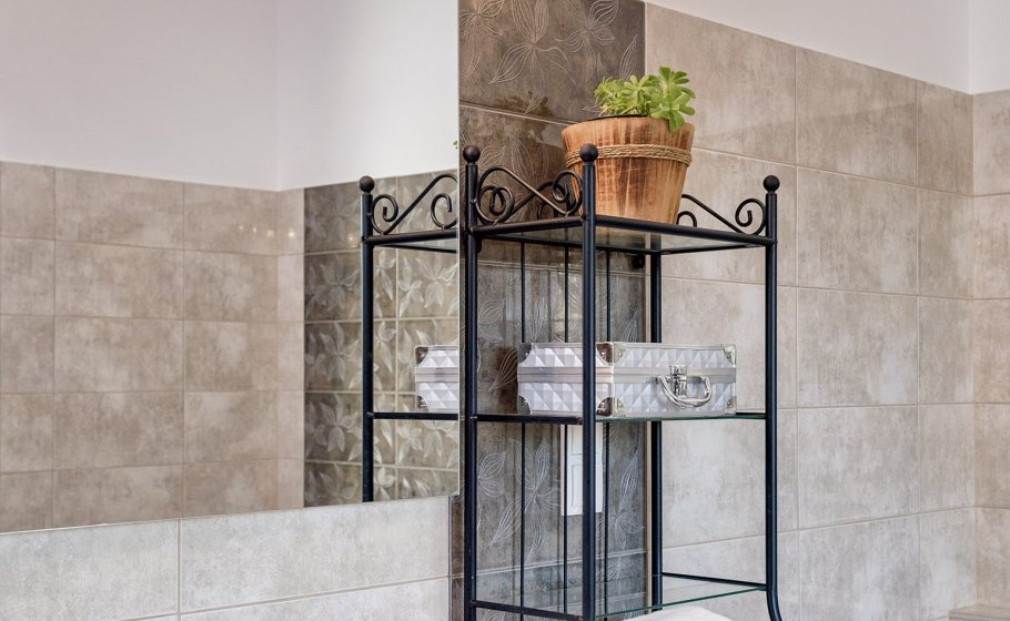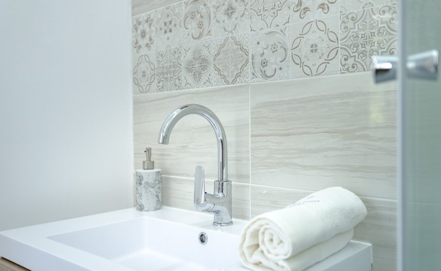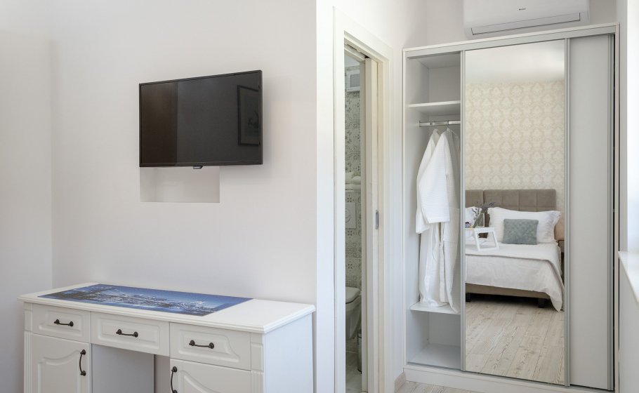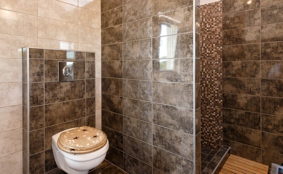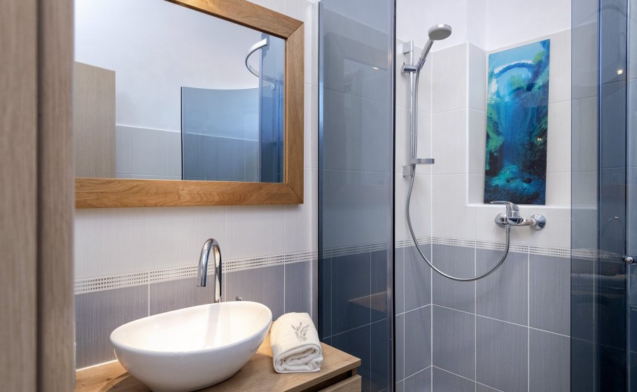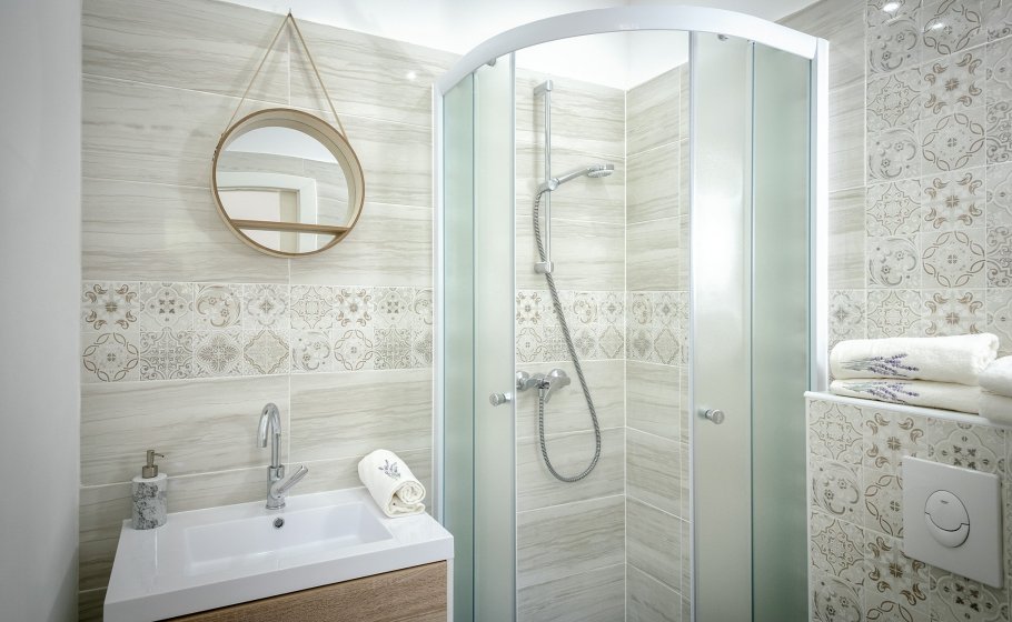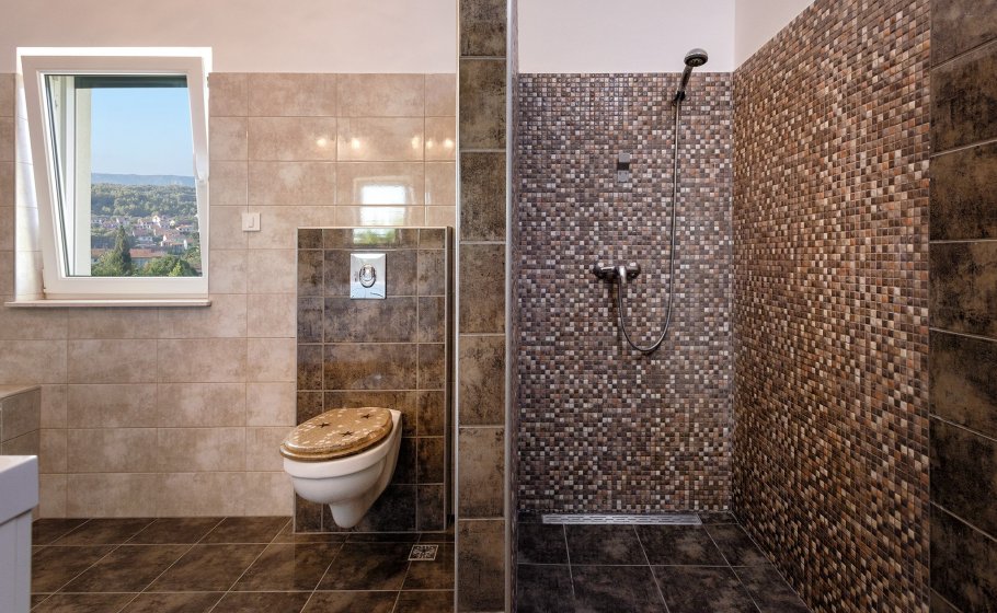 Let’s now go back to the dining room/living room area. Twenty or so steps lead you from this area to the first floor of the house. From the anteroom, you can enter three double bedrooms with matrimonial beds and en-suite bathrooms. Two of the rooms have shower trays, the third has a shower tray and a jacuzzi bathtub. Also, one bedroom has a balcony overlooking Stari Grad, whereas the other two have windows overlooking the garden with the pool.