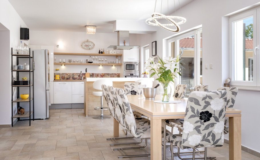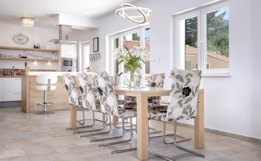 Let’s go back to the entrance. Once you open the door, you’ll see a short hallway with doors to the left and right. One of them leads to a small toilette for guests, whereas the other opens to a small storage room. In front of you, you’ll see the spacious area of the dining room with the kitchen and the living room. In the kitchen, there is another door that leads to a small pantry. The dining room continues onto the spacious living room with windows overlooking the garden with olive trees and other Mediterranean foliage.