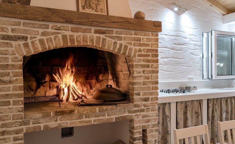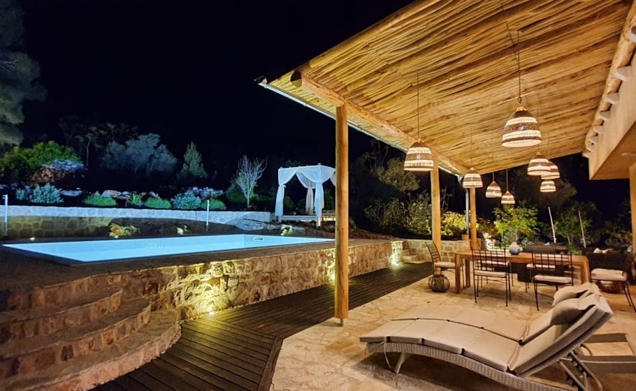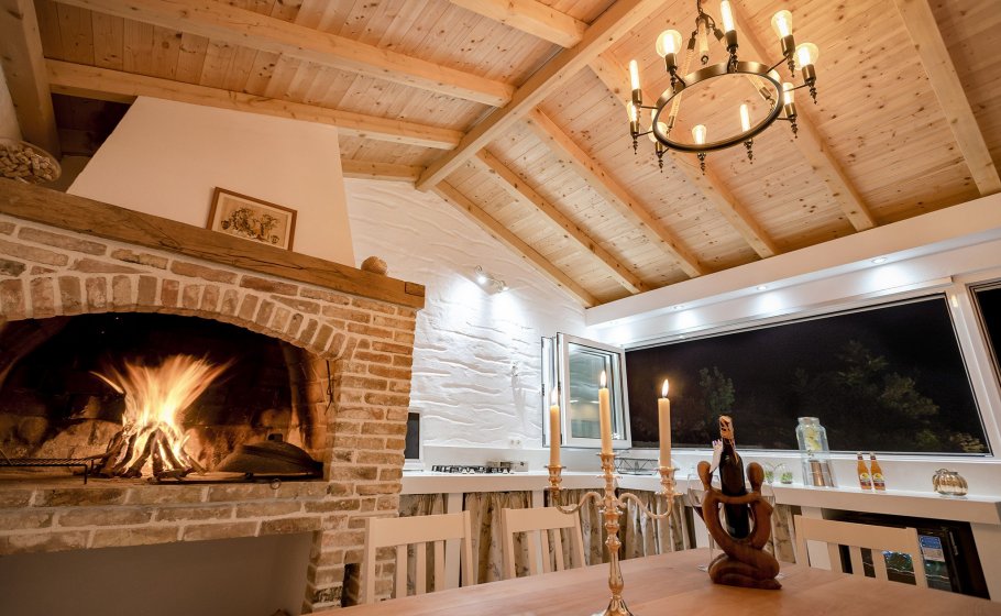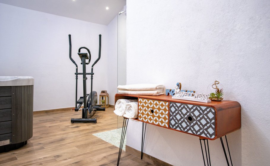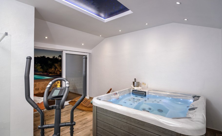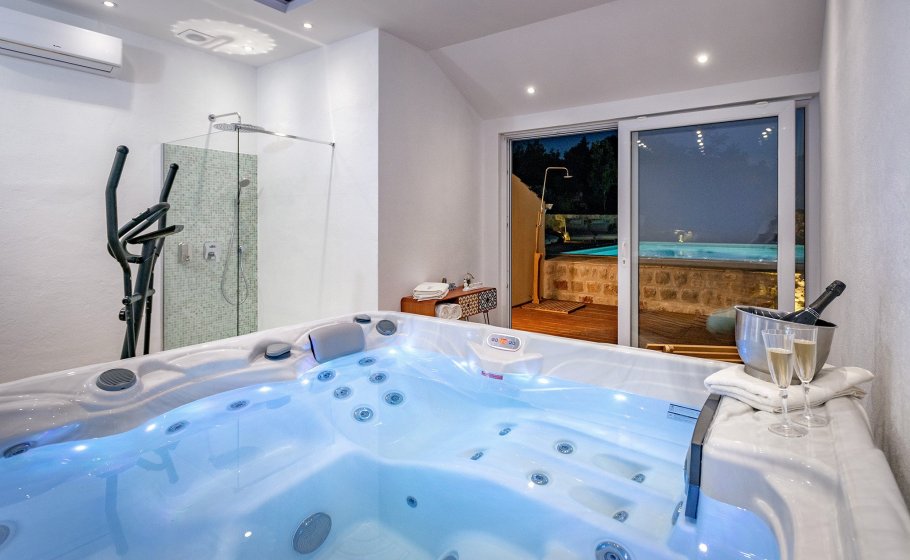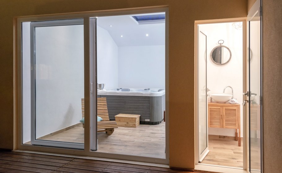 To the left of the area of the garden and terrace with the pool, you’ll see three extra rooms: an open kitchen with a stone fireplace and a dining room facing the pool and terrace, which can also serve as a lovely bar with high chairs (the owners did truly think of everything); next to it, there is a hot tub room with an additional bathroom with a shower tray; and finally, there is a small room for house maintenance supplies.