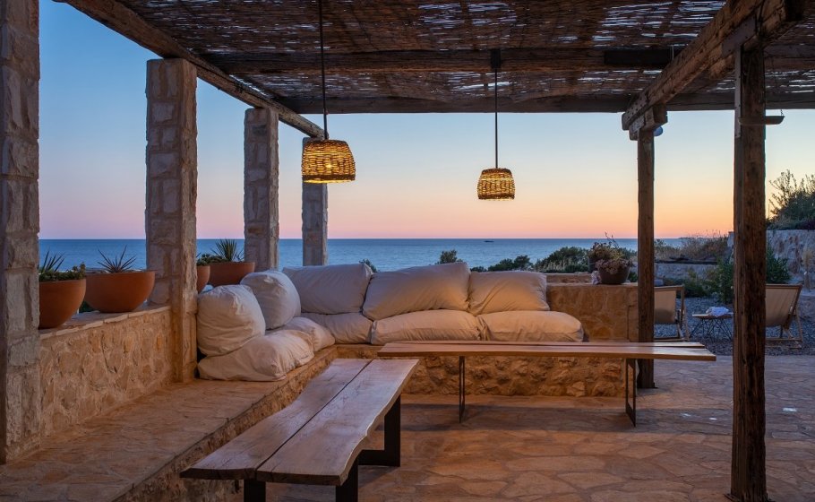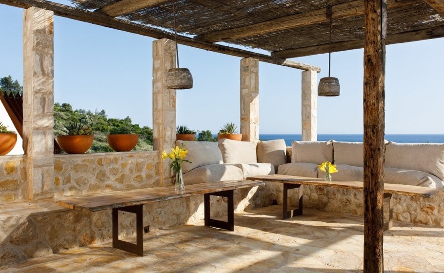 In front of the main house, there is a large front yard covering 80m2 with a pergola on wooden pillars. On the eastern side, there is a stone bench covered with pillows and with two low-lying tables, which is also the lounge area of the yard. At the center of the yard, you’ll find a massive table with 6 chairs. The yard with a view of the open sea reminds us of a moving ship. Adjacent to the yard, you’ll see the olive grove, where you’ll also find deck chairs.