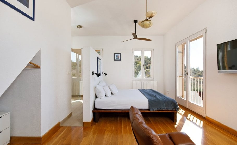On the ground floor of the main house, you’ll find a brick kitchen with a fireplace, an olive-wood table with six Tapiovaara style Fanett chairs we simply love, a sofa that can extend to a bed the size of 160 x 200 cm, an LCD TV with satellite programs, and a stereo mini HI-FI. The ground floor also has a toilet. You take the stairs to the first floor, where you’ll find a room the size of 30m3, with a matrimonial bed (180 x 200 cm), two chairs and table, an LCD TV with satellite programs, and a bathroom.