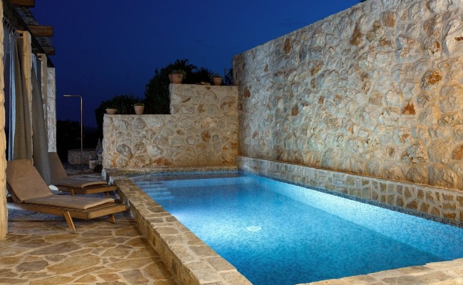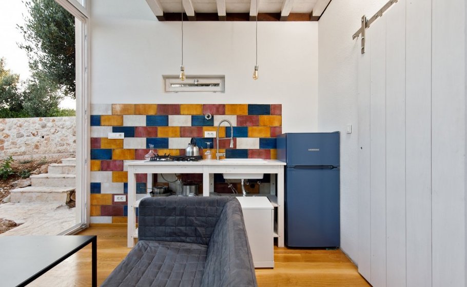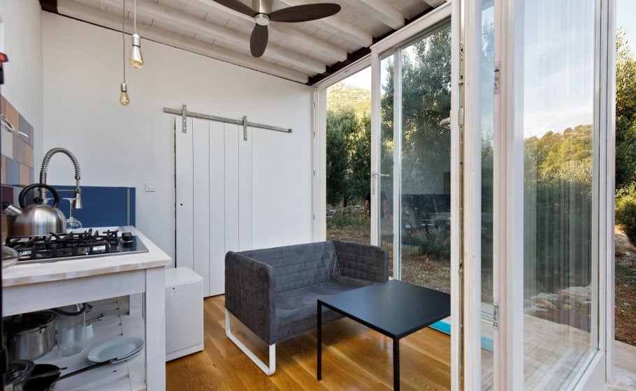 The garden pavilion covers 15m2 and stands out with interesting architecture and imposing glass walls. It is entirely open towards the olive grove, and the idea was to have a space where you’ll enjoy the paradigm of the Mediterranean surrounding – an olive grove on terraces built on drystone walls. The pavilion has a bathroom, a small kitchen with a fridge, and a sofa with a table. It also has a matrimonial bed (160 x 200 cm).
