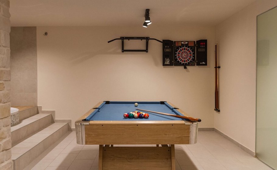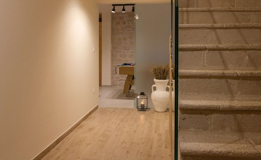 In both villas, the underground is the zone reserved for relaxing. It consists of a fitness area, sauna (planned for 2017), Jacuzzi, and a game room. There you will also find a small wine cellar located on a stone wall, where you can enjoy in some of the best Croatian wines. Nazdravlje!