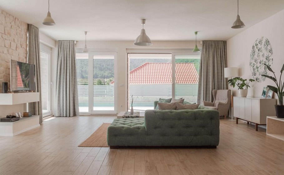 On floor zero there is an open plan kitchen/dining/living room area. The kitchen is fully equipped, the dining area has a dining table for eight people, and it is placed between the kitchen and the living room which has a TV and sofa for eight people. The entire area of the living room/kitchen/dining room is airy and bright as it is on all sides covered with glass walls (three pairs of large sliding glass doors) through which you can enjoy the view of a beautiful and spacious garden the size of 150 m2, terrace, lawn, and greenery which surrounds the villas. The pool area has an amazing view of the village of Pitve and the town of Jelsa. Of course, Adrasteia has a different kind of view since it is located in front of Echo, but Echo is located at a somewhat higher altitude. As it is in life, it seems that neither of them has everything; but each has something!