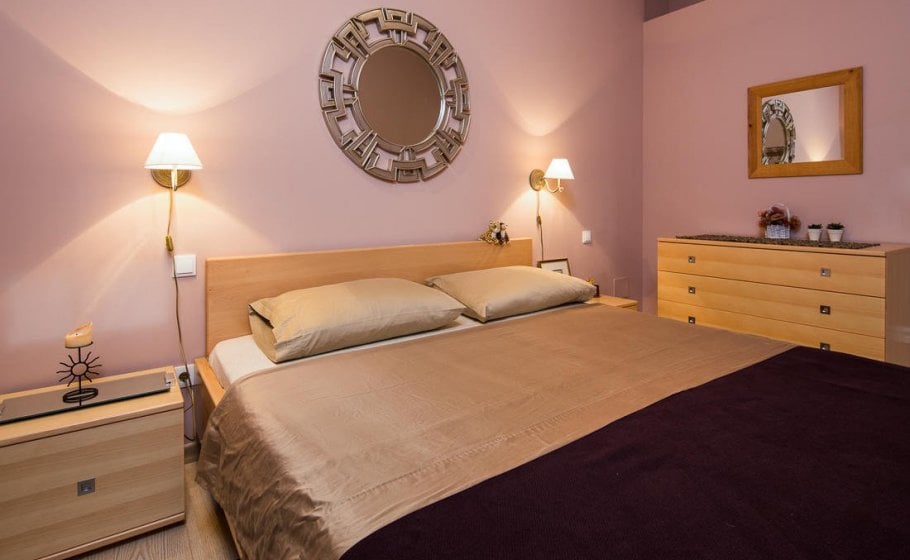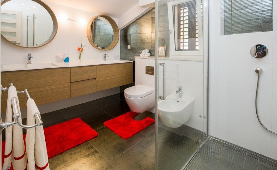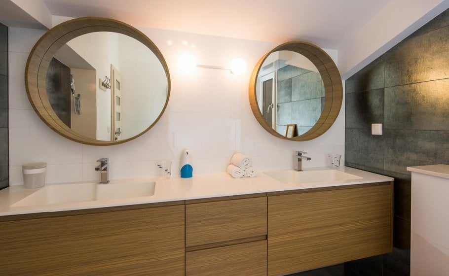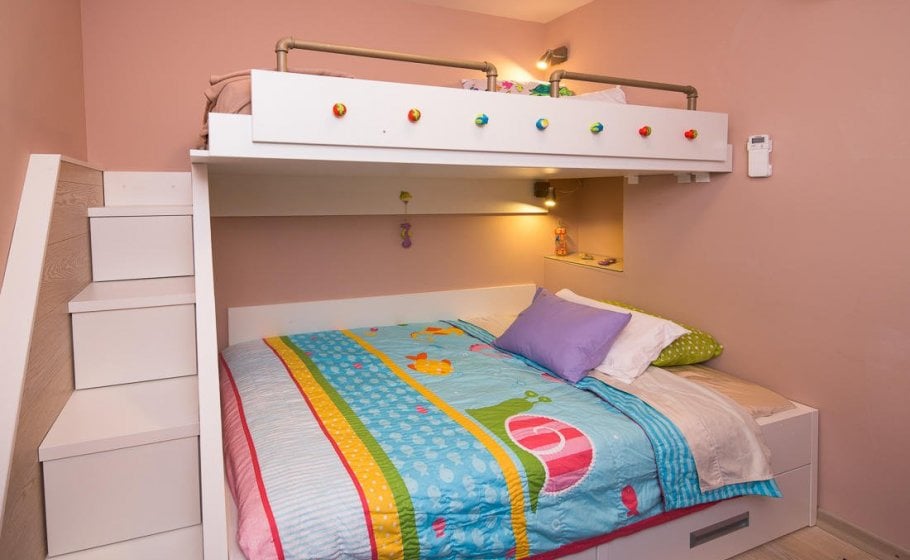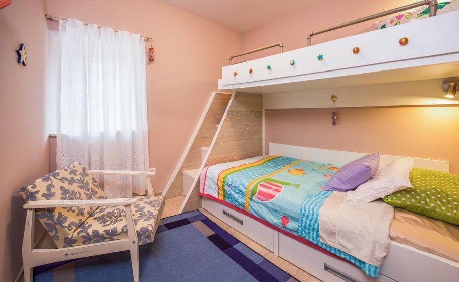 On the first floor there are two bedrooms with large queen beds and one bedroom with bunk beds (120x190 & 90x190). There is one large bathroom on the first floor with double sinks. Each room is equipped with AC and the two adult bedrooms are equipped with intimate RBG mood lighting.