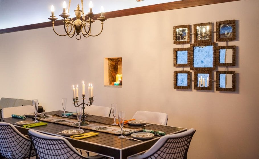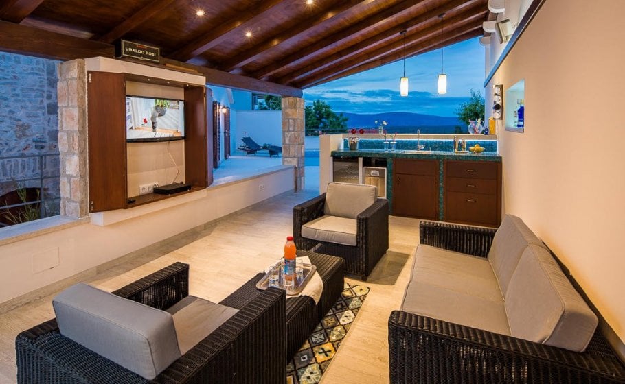 The outside terrace and swimming pool drifts into a sheltered area with a fully stocked bar with wine fridge and ice maker. Just past the bar, the area continues on to become an outdoor living room (lounge area) with an additional TV and just beyond that is a specious dining area that seats 8 plus.