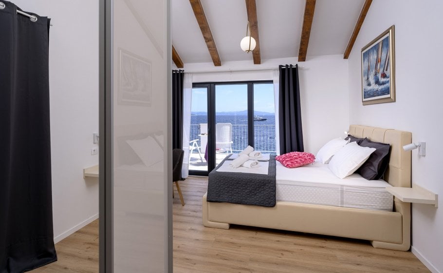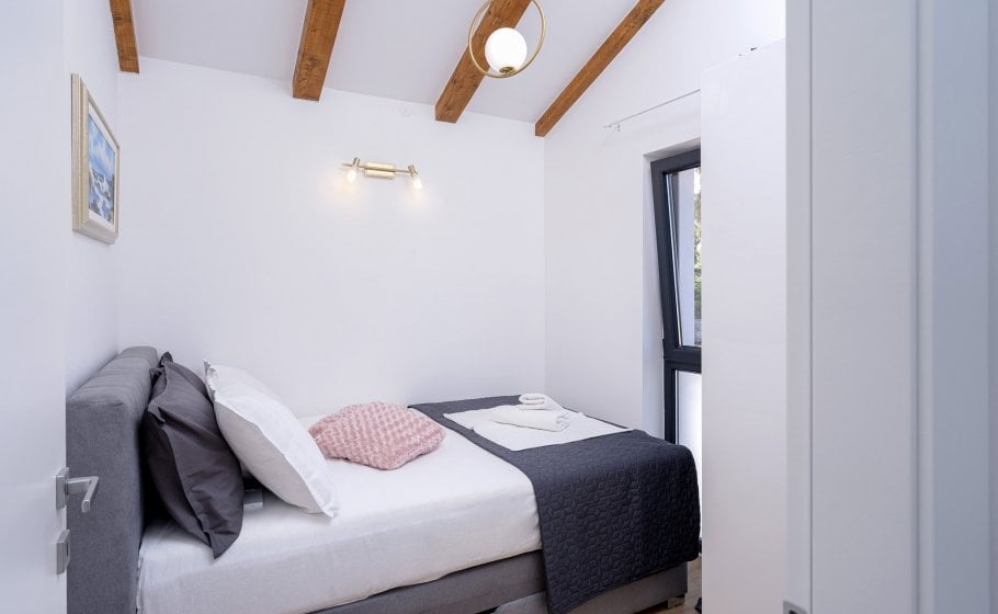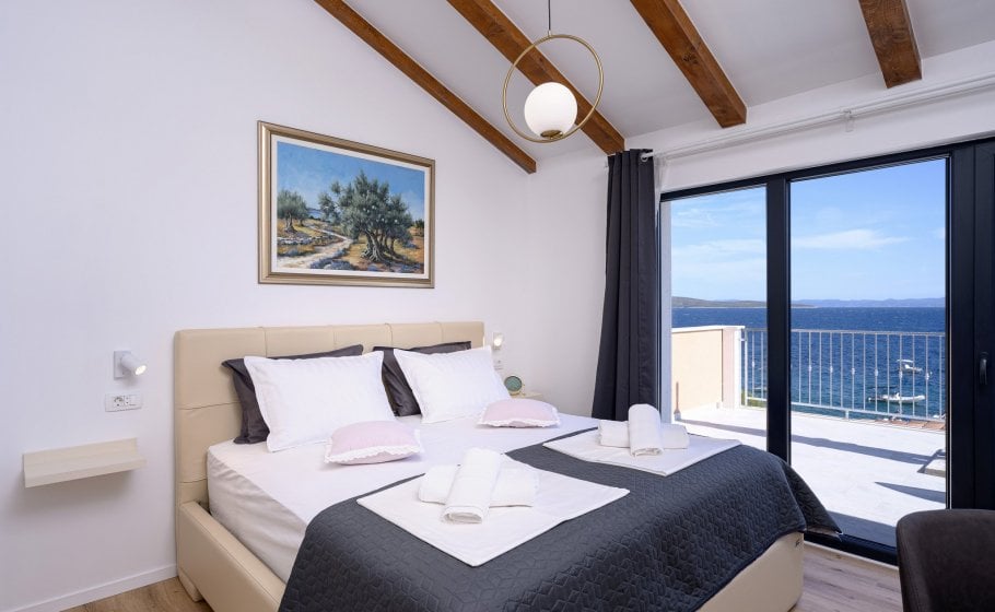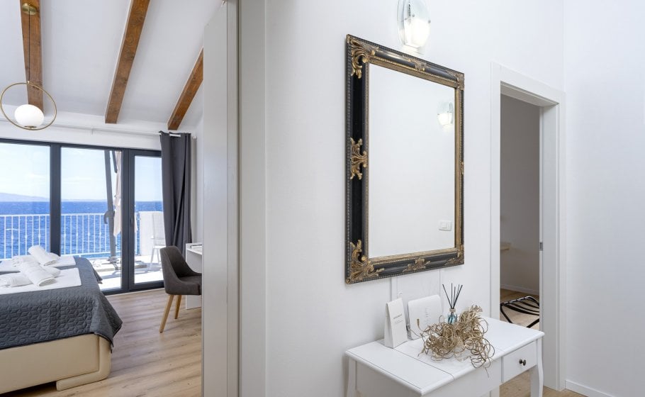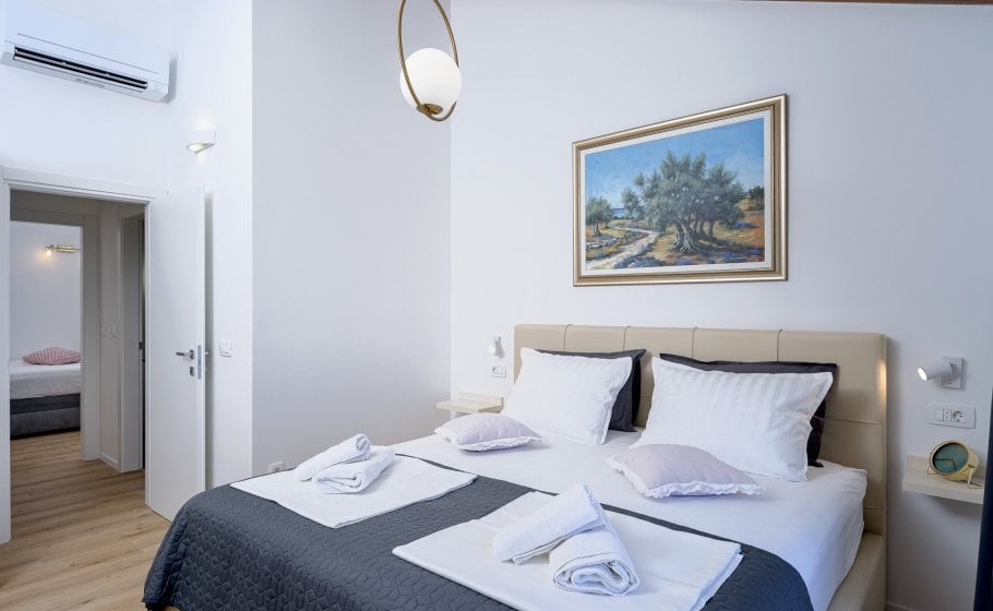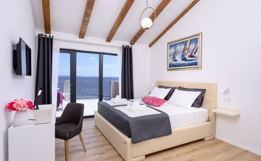 If we go back up the stairs and head up, we arrive on the first floor of the villa, with a hallway from which you enter the three bedrooms. Two bedrooms have large double beds and glass walls that lead directly to a 32m2 terrace with a magical view of the sea and the Adriatic archipelago. The third room has a smaller, French bed for children and those who feel like ones.