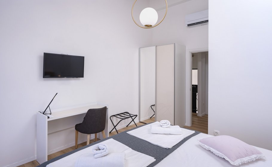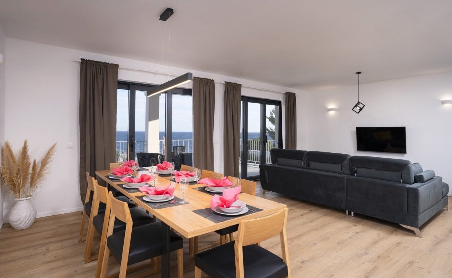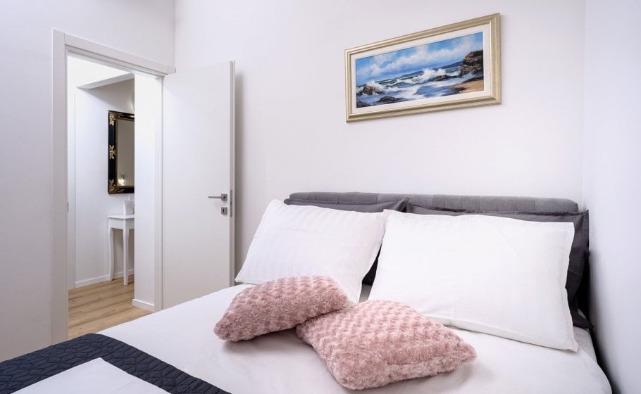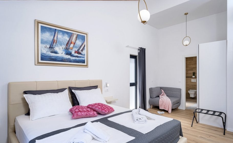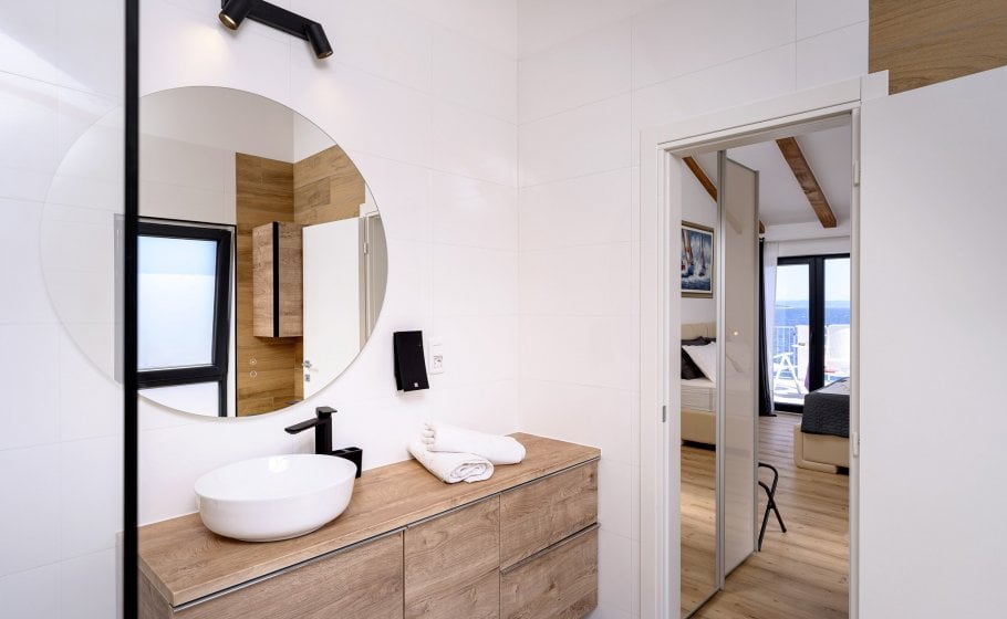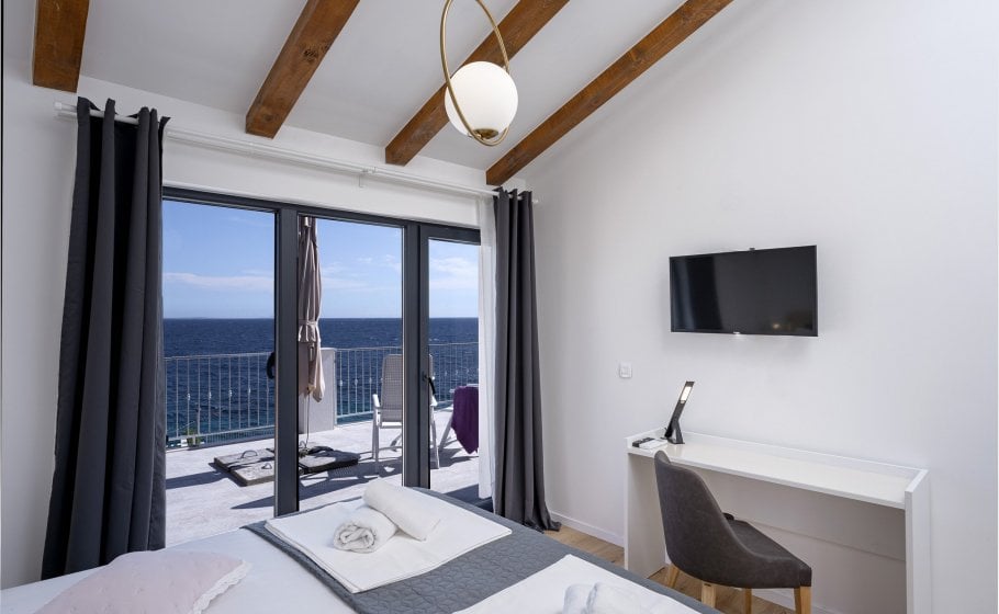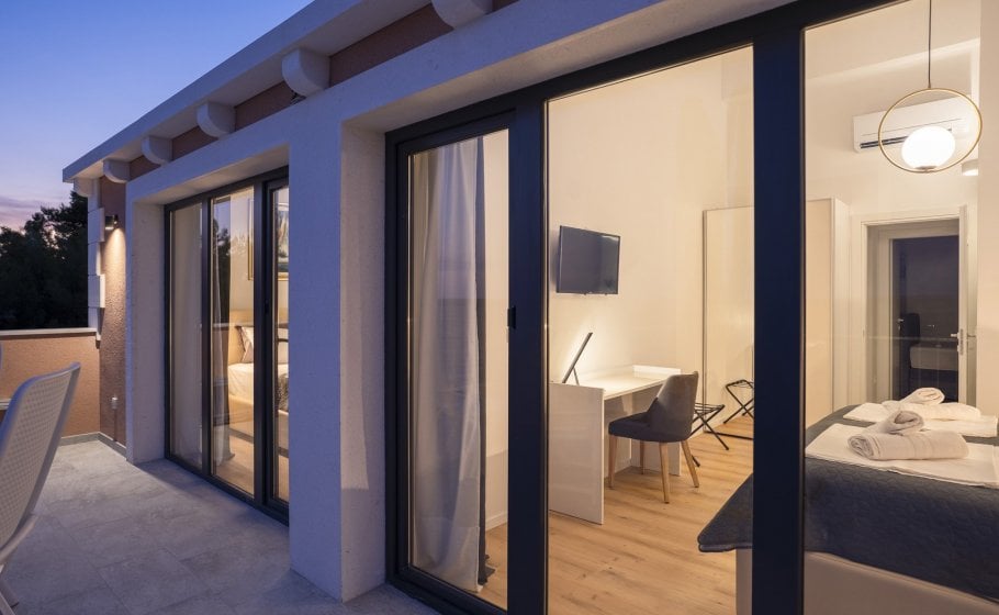 If we go back up the stairs and head up, we arrive on the first floor of the villa, with a hallway from which you enter the three bedrooms. Two bedrooms have large double beds and glass walls that lead directly to a 32m2 terrace with a magical view of the sea and the Adriatic archipelago. The third room has a smaller, French bed for children and those who feel like ones.
