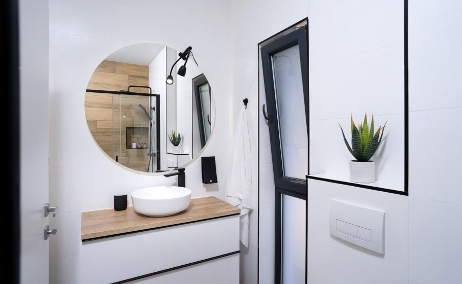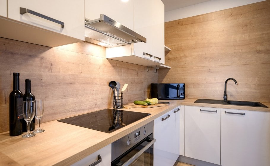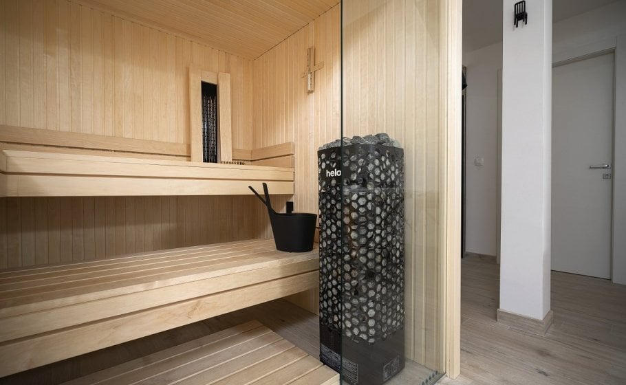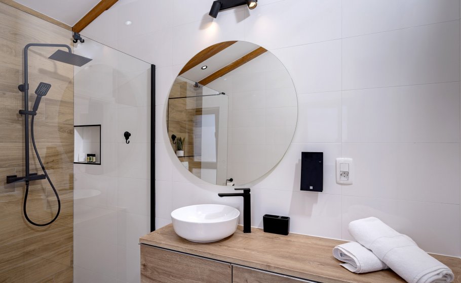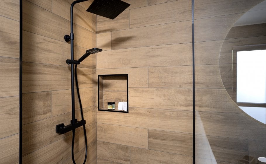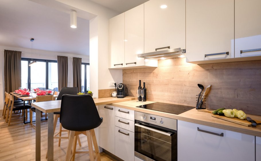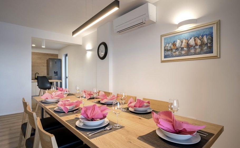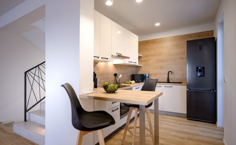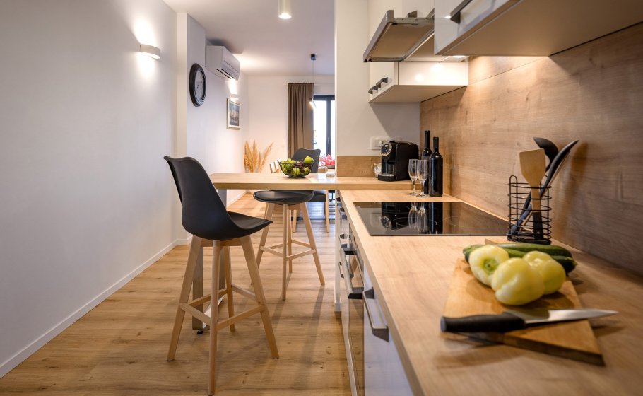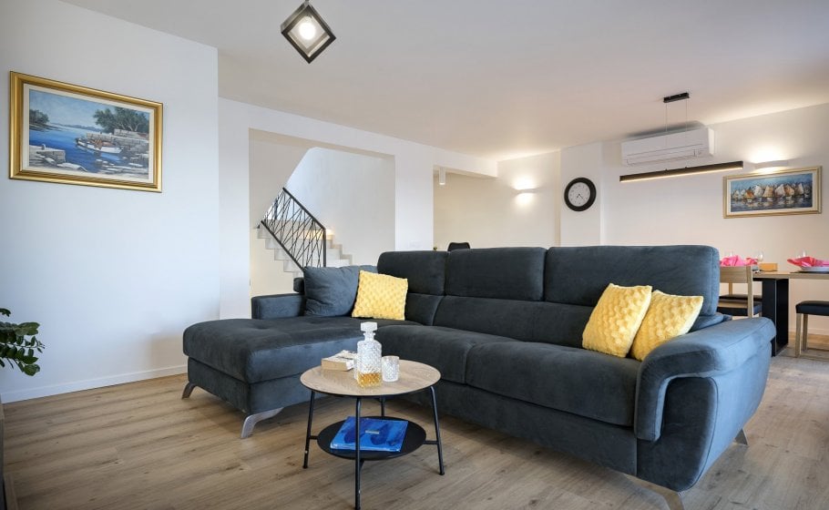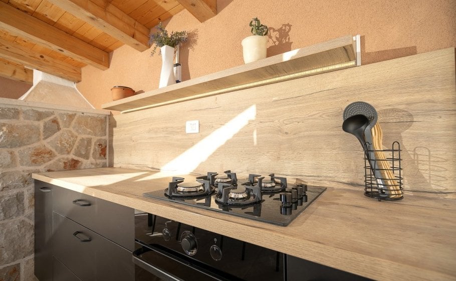 Downstairs they lead to the ground floor, where you’ll find a fully equipped kitchen with a dining area and a living room, but also the first spacious bathroom with a shower tray. In the living room there is a sofa that can accommodate two people if needed, although the ideal capacity of the villa is six.