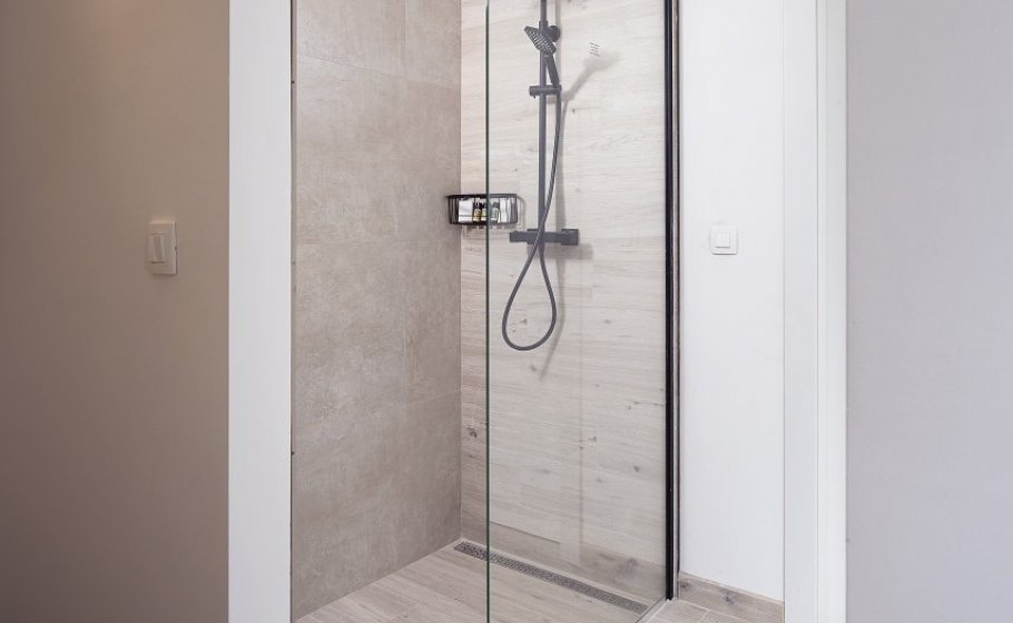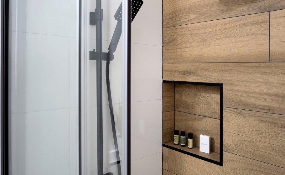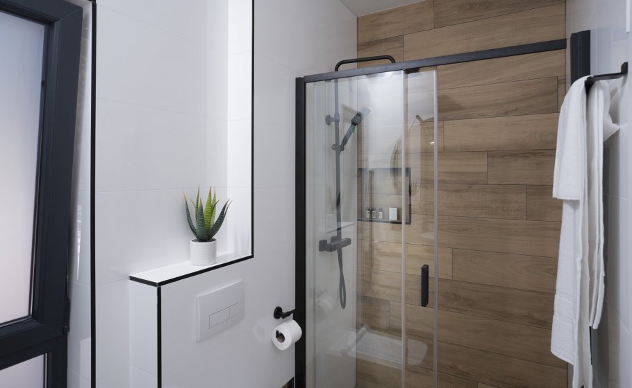 On the first floor, there are also two bathrooms with shower trays; one is en-suite and belongs to the right master bedroom, whereas the other bathroom with a shower tray is shared by the other two rooms on the left.
