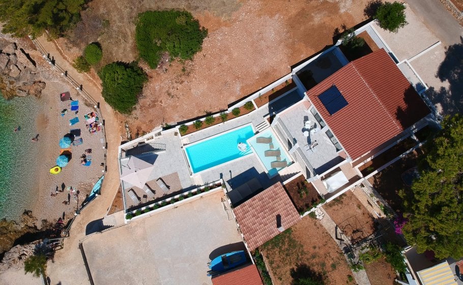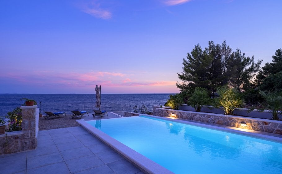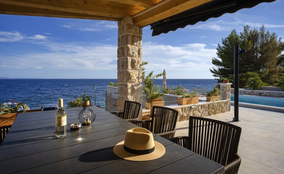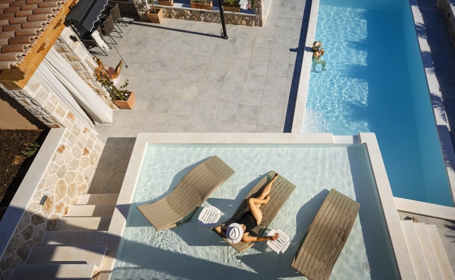 Galateia is located on the south side of Hvar. It has a beautiful pebble beach in front; you could jump into the sea from the terrace, but don't do it. On the terrace, there is a pool for big people and a pool for small people. Galateia offers perfect sunrises and even more perfect sunsets. And no, we're not exaggerating.