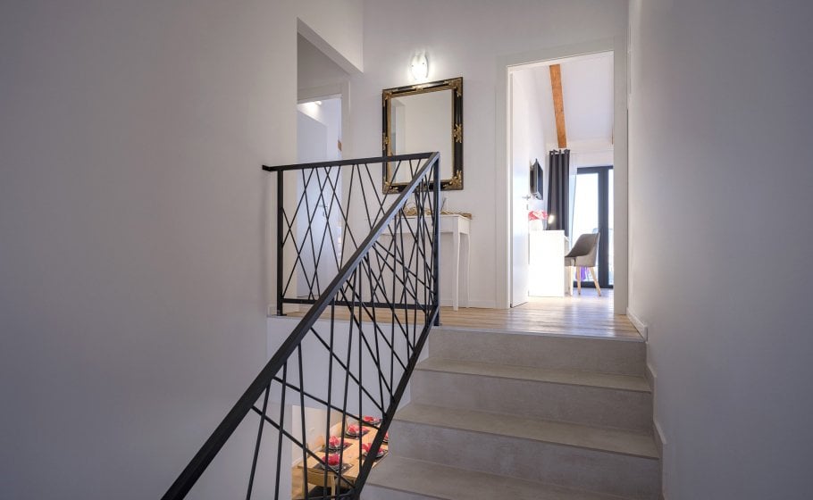 The main entrance to the villa is at the back; you reach it from a small country road from which you turn to the private parking lot of the villa, where there is usually room for three cars. After a couple of outside stairs, you’ll find yourself inside, on the main staircase of the villa with an interesting railing.
