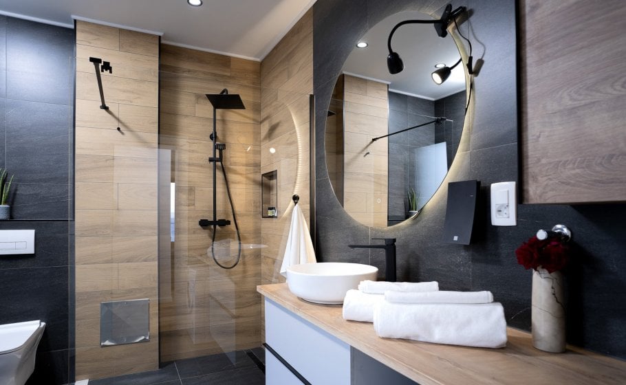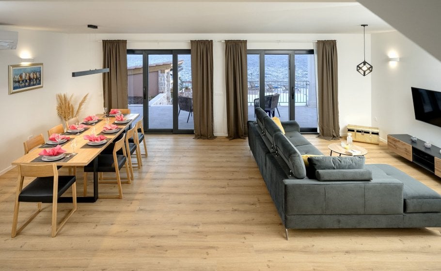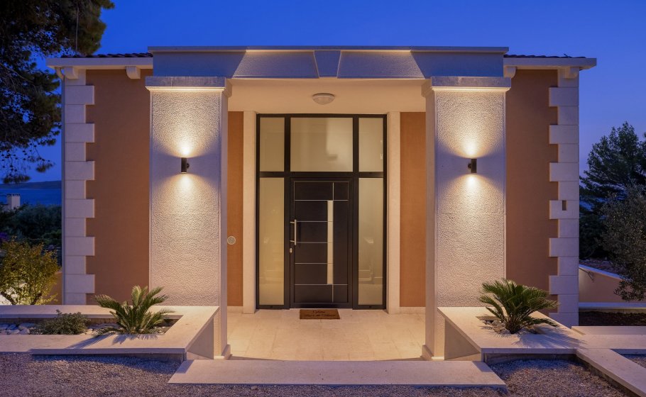 In numbers – the interior of the villa spans over 245m2 and extends to 3 floors (basement, ground floor, and first floor), while the exterior of the villa extends over 350m2. The basement and the ground floor of the villa cover 75m2 respectively. The villa has a main terrace that extends to the sea and two large balconies, each measuring 32m2. The main pool is 40m2 in size, and the additional baby pool is 10m2 in size.