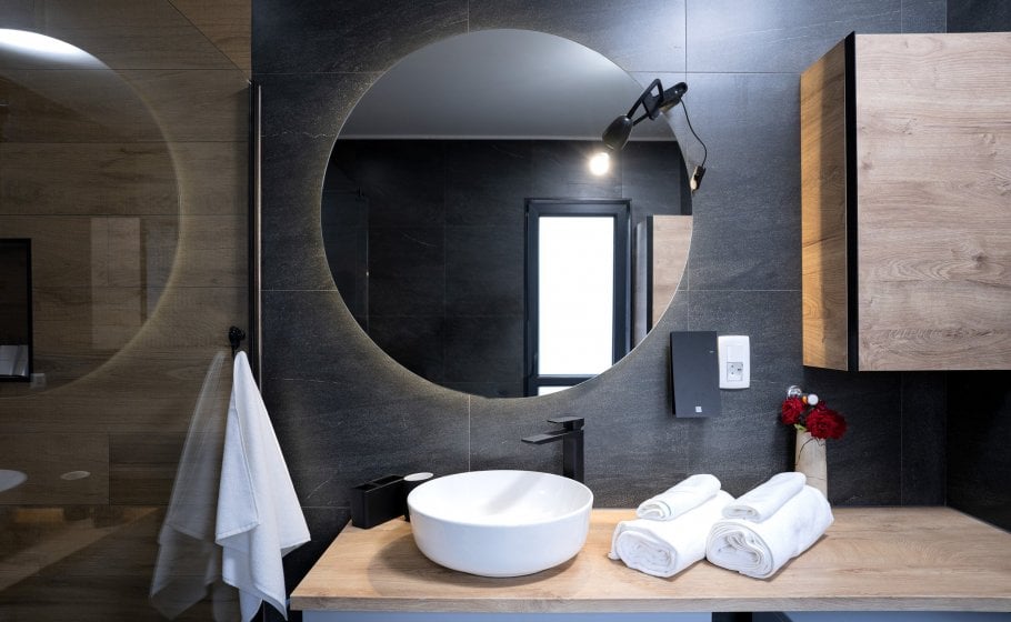 The dining and living room area opens through a large glass door to a 32m2 terrace with a beautiful, soothing view of the sea. The wonderful part is that all the interiors of the villa have a beautiful sea view, and the interiors of Villa Galateia are rather minimalist and neutral in color, so that nothing disturbs the zen and the main role of the blue sea.