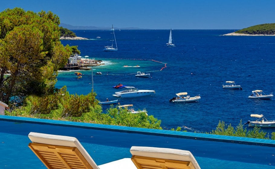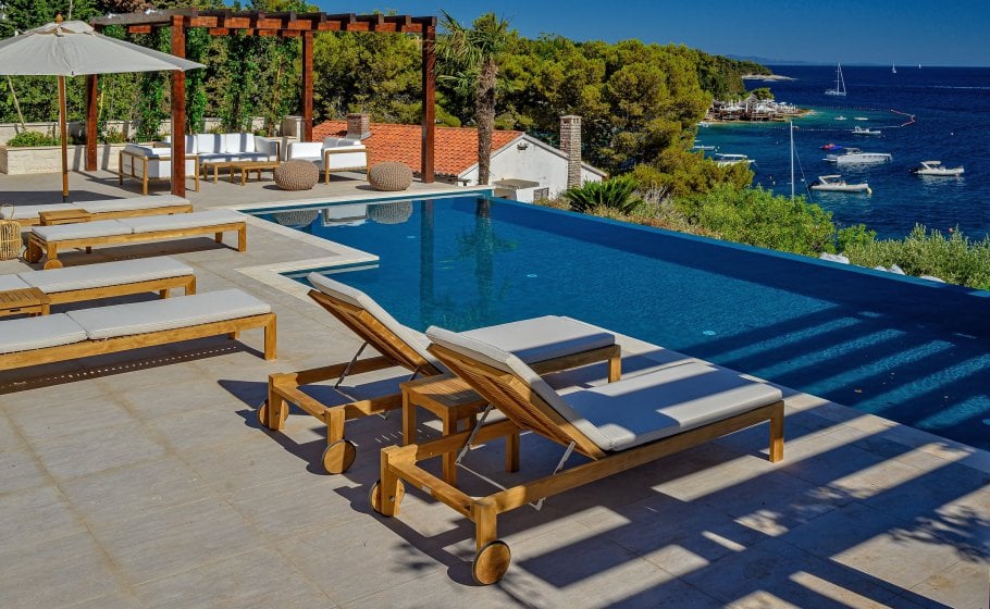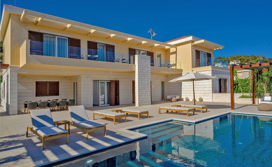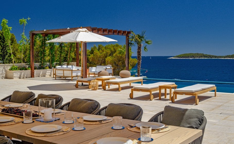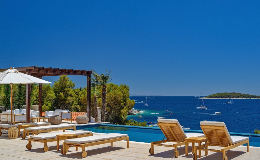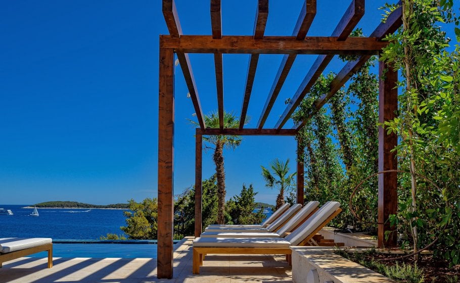 The villa can accommodate 10 persons in total. Guests have at their disposal 5 bedrooms, each with an en-suite bathroom, a HD satellite system (Astra), LCD TV, fiber-optic internet, dual-band Wi-Fi indoor and outdoor, SONOS music systems for public and outdoor areas, as well as Hitachi central air conditioning with individual room control. All the rooms have balconies, offering astonishing sea views. The outdoor space is enriched with several relaxing and dining areas: the main terrace with a table for 10 persons, a lounge area, a pool area with sunbeds and sun umbrellas, all overlooking the beautiful deep blue, pines, palm trees, and Pakleni Islands. Suffice to say that next to these villas is the presidential villa, and we all know that presidents love the best things life has to offer.