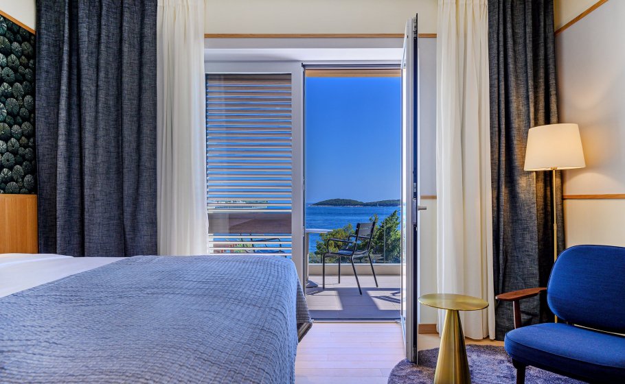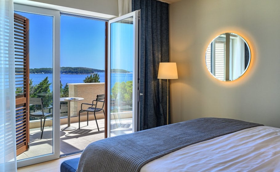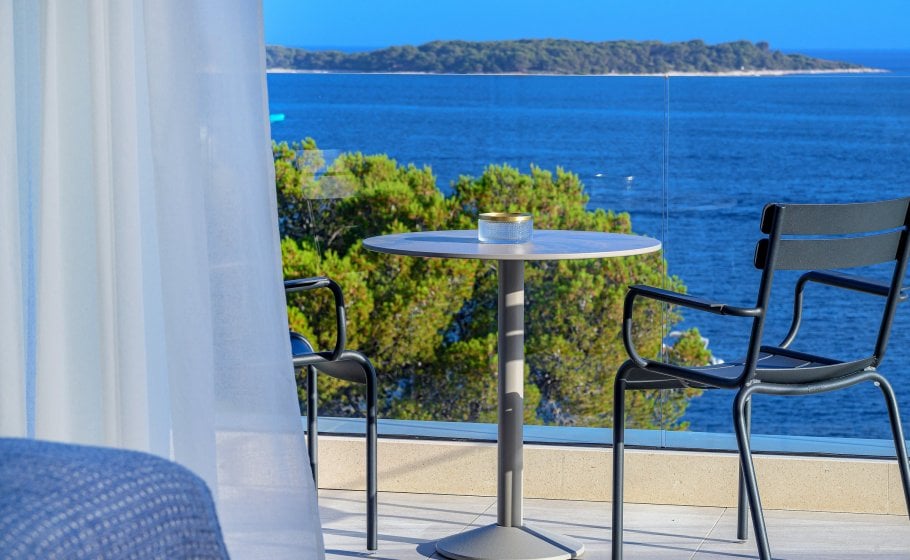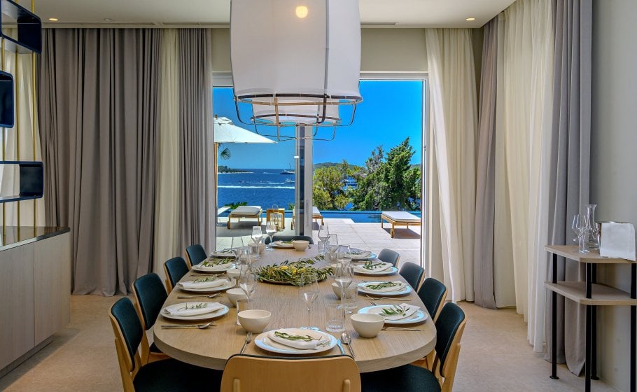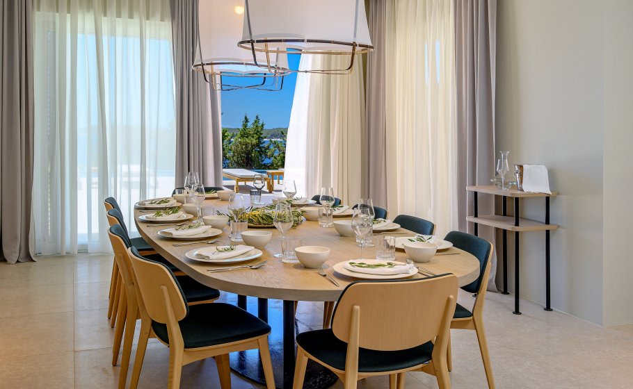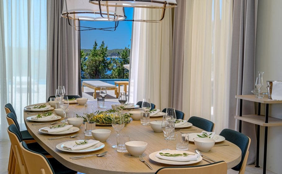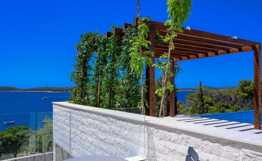 The villa can accommodate 10 persons in total. Guests have at their disposal 5 bedrooms, each with an en-suite bathroom, a HD satellite system (Astra), LCD TV, fiber-optic internet, dual-band Wi-Fi indoor and outdoor, SONOS music systems for public and outdoor areas, as well as Hitachi central air conditioning with individual room control. All the rooms have balconies, offering astonishing sea views. The outdoor space is enriched with several relaxing and dining areas: the main terrace with a table for 10 persons, a lounge area, a pool area with sunbeds and sun umbrellas, all overlooking the beautiful deep blue, pines, palm trees, and Pakleni Islands. Suffice to say that next to these villas is the presidential villa, and we all know that presidents love the best things life has to offer.