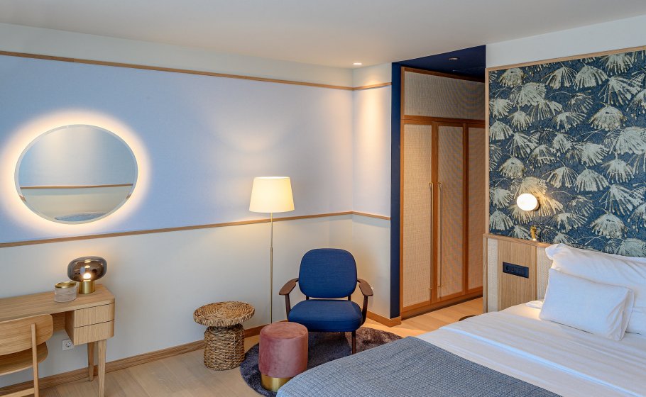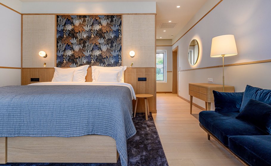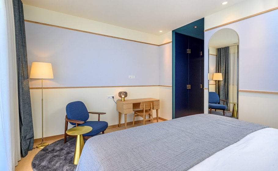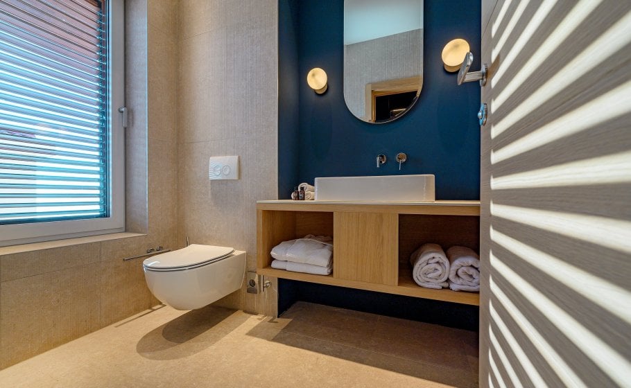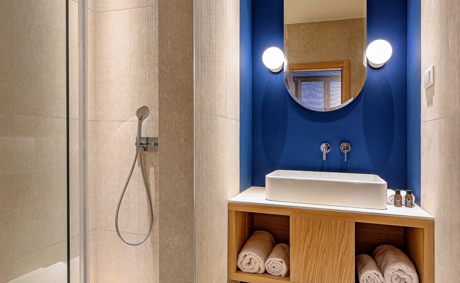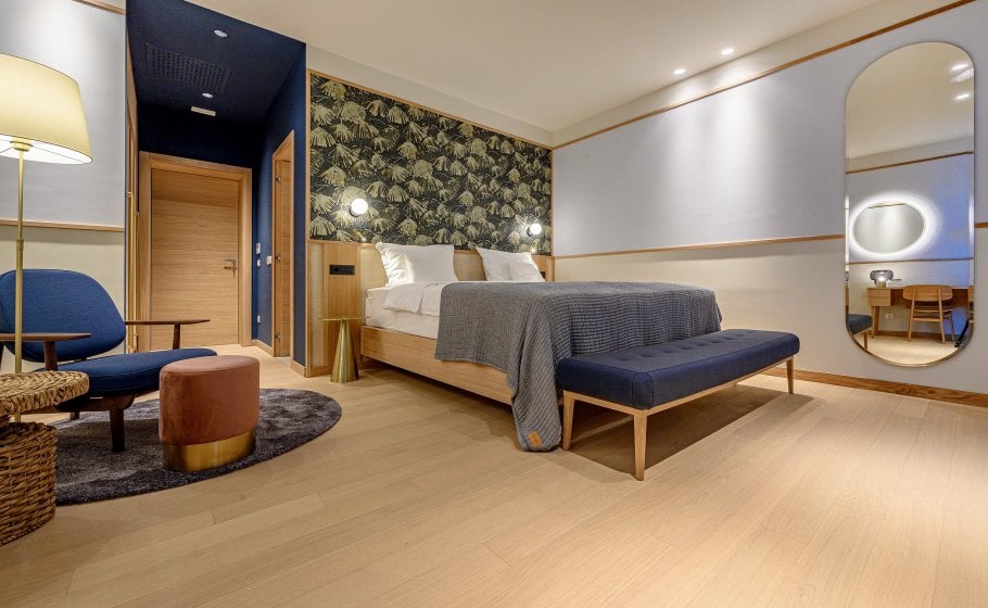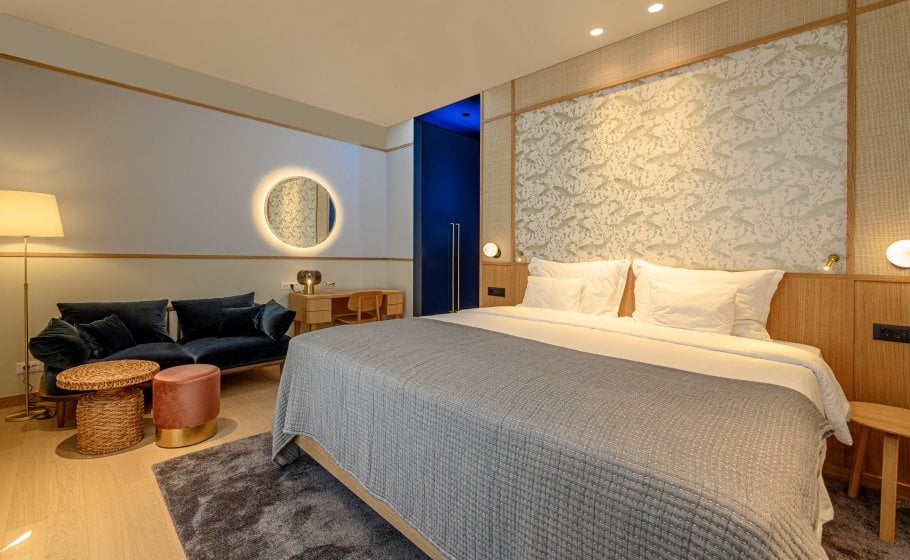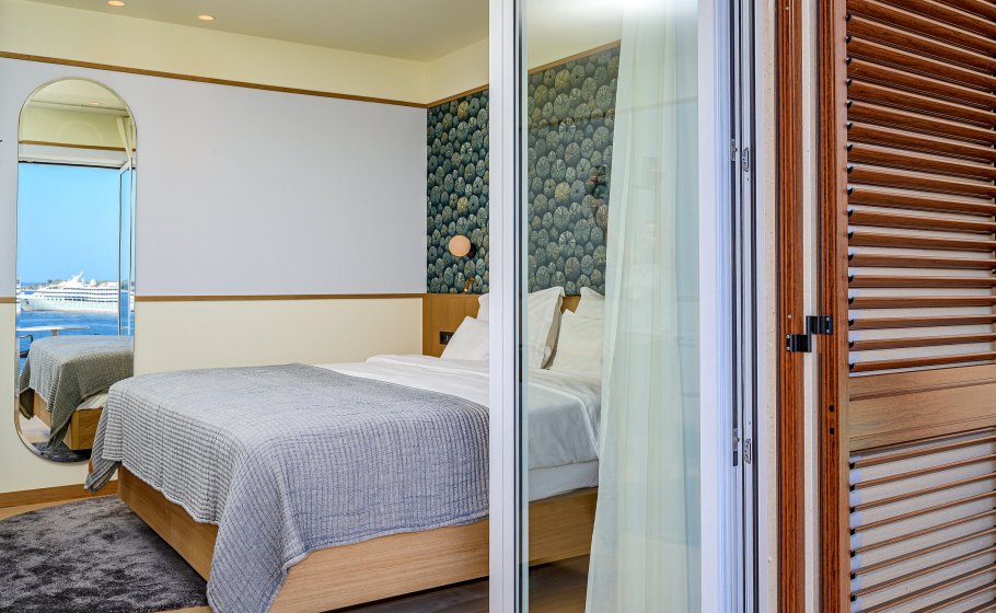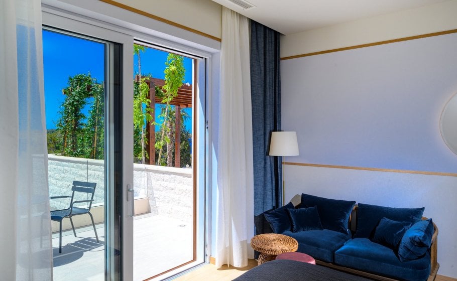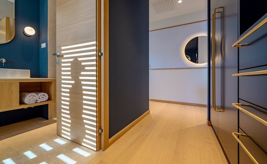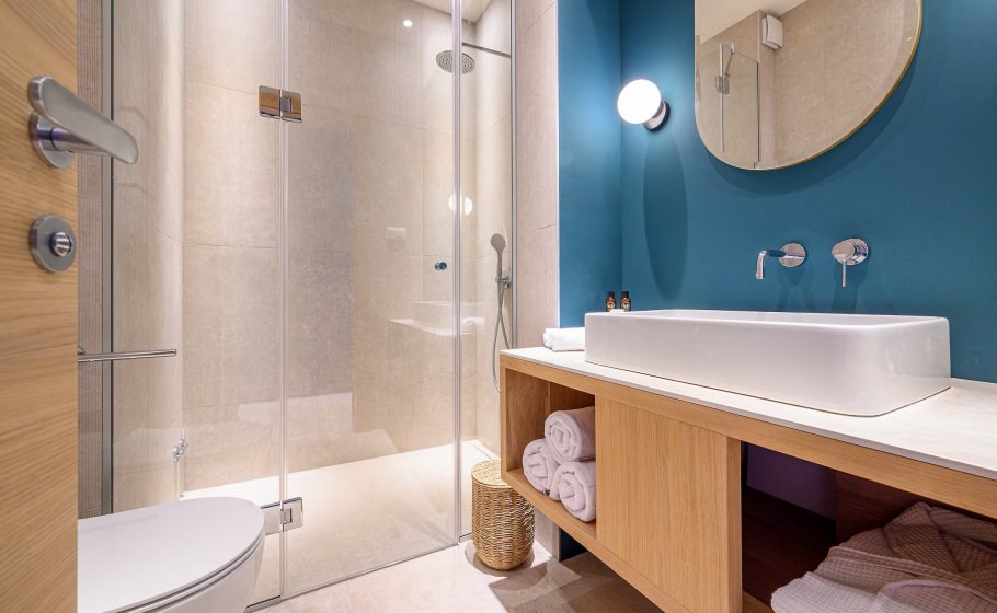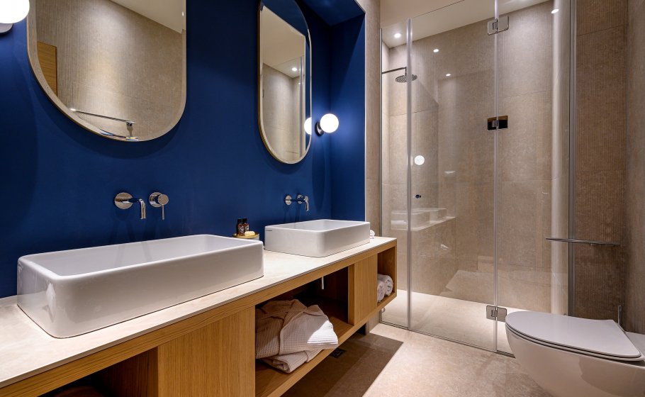 On the first floor of Hermes Blue, there are 4 bedrooms with king size beds (200x210cm). All bedrooms have en-suite bathrooms with walk-in showers, hairdryers, and all the necessary amenities. All have direct access to the sea view balcony, a 55-inch smart TV, cabled and Wi-Fi Internet access. Also, each room has its own wardrobe with an integrated safe. Two of the mentioned king size beds can be converted into twin beds (100x210m each), according to your personal needs and wishes.