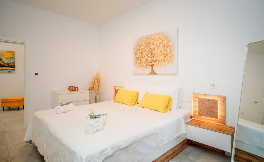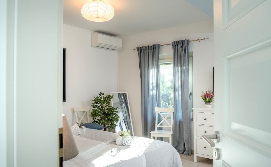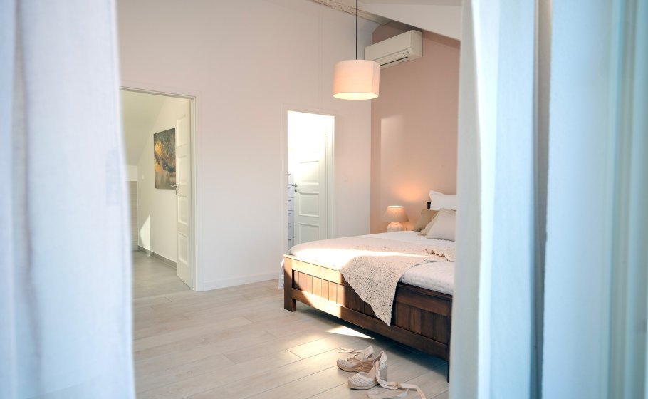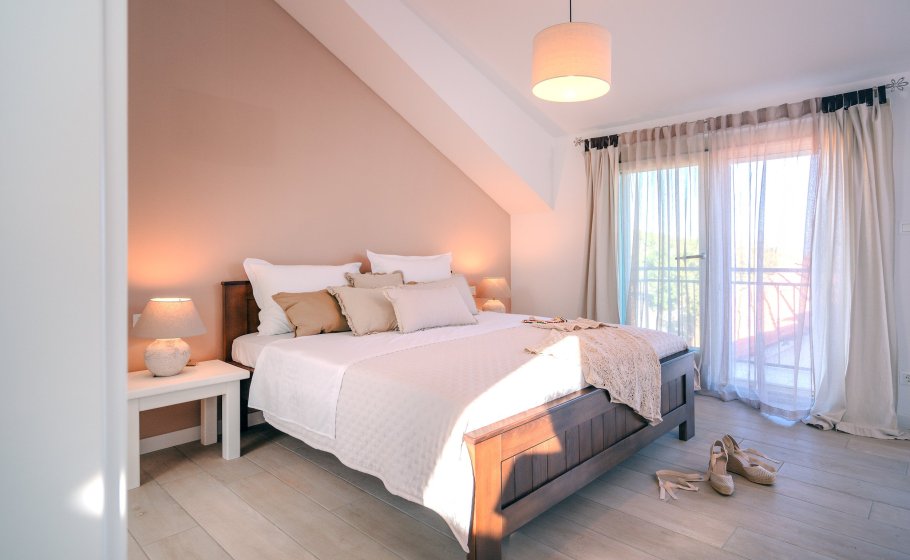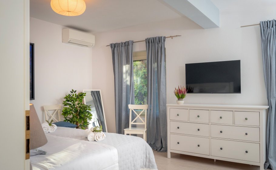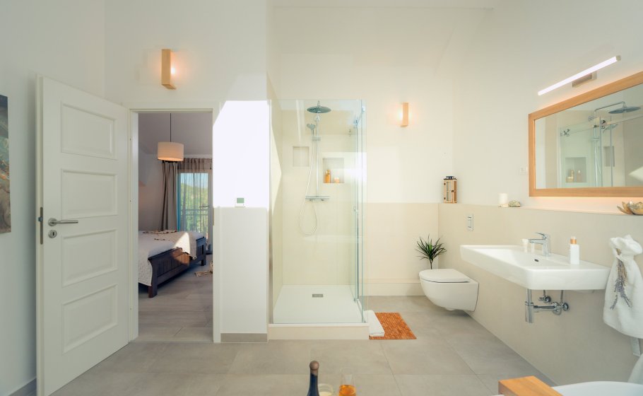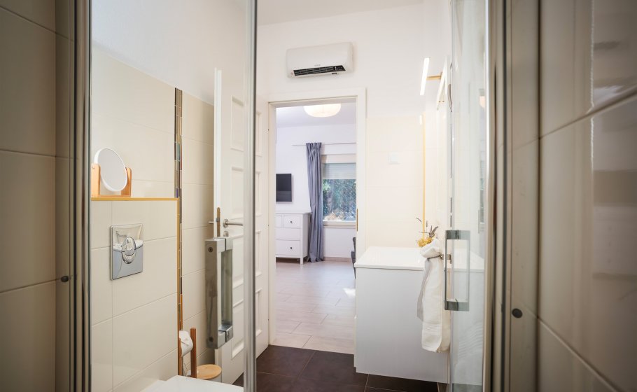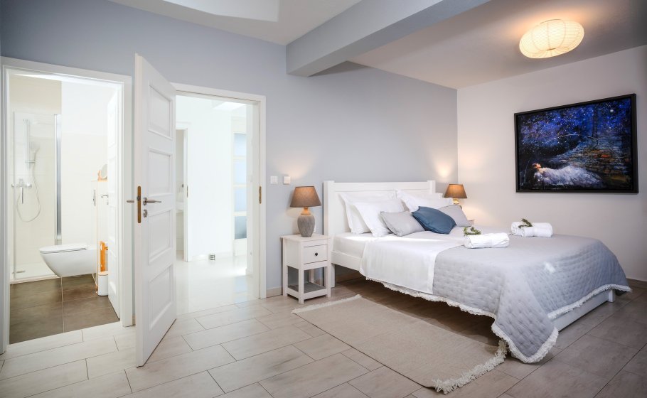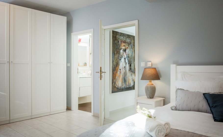 As soon as you open the door of Villa Iris, you’ll find yourself in the entrance hallway. To the right is a small toilet, and across from it is the first bedroom, 23m² in size, with a 4m² bathroom. This room has a matrimonial bed (180x200), and the bathroom has a shower tray.