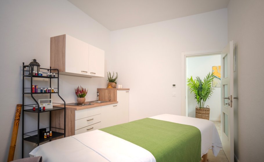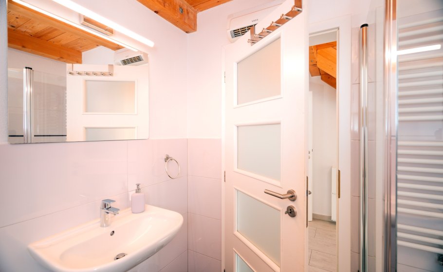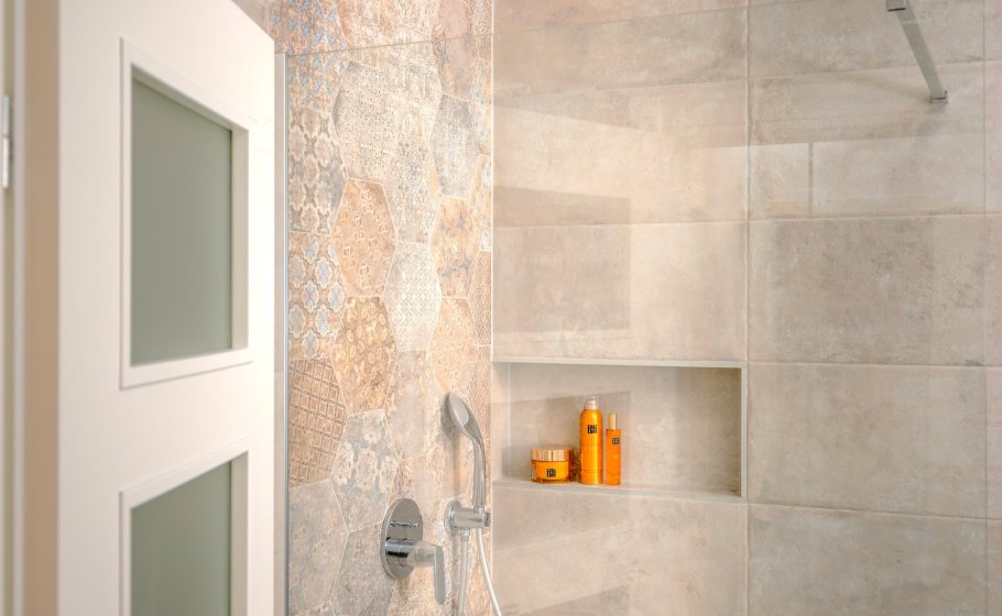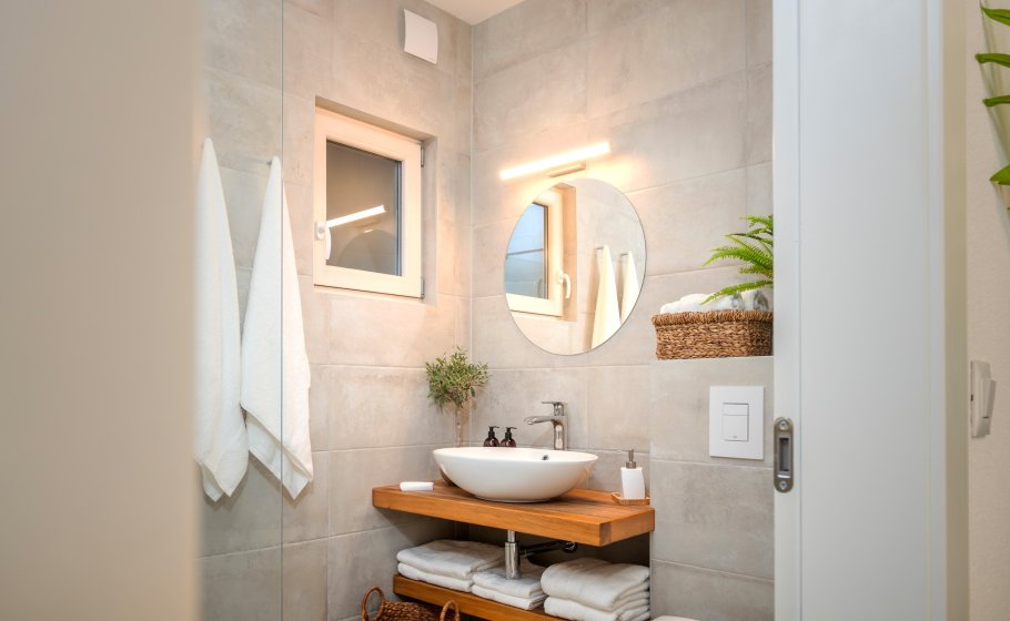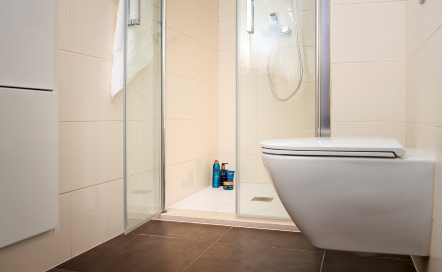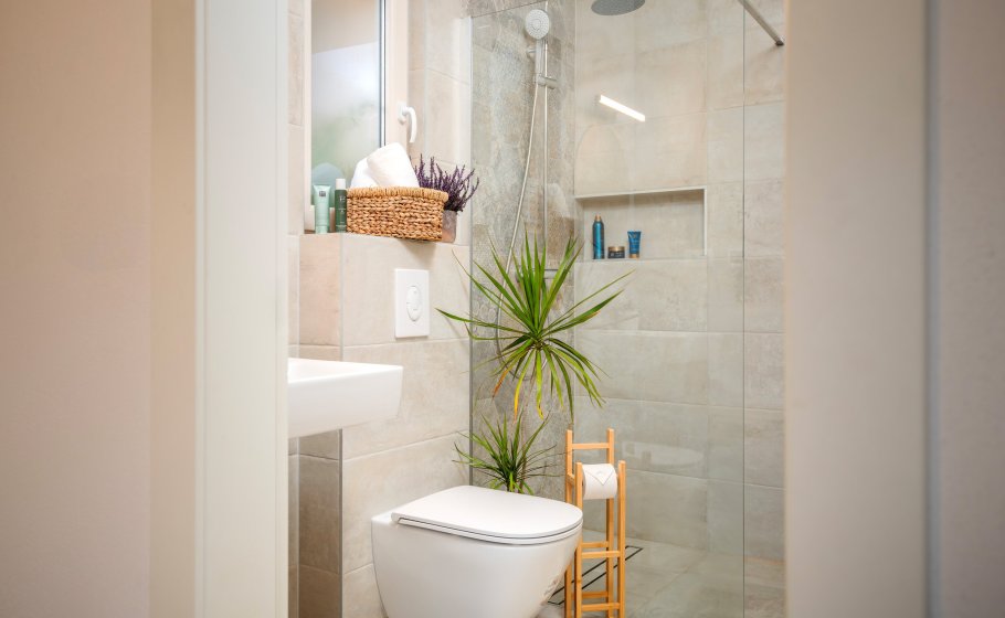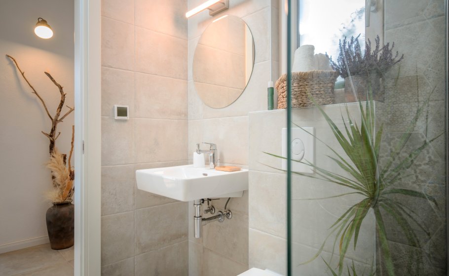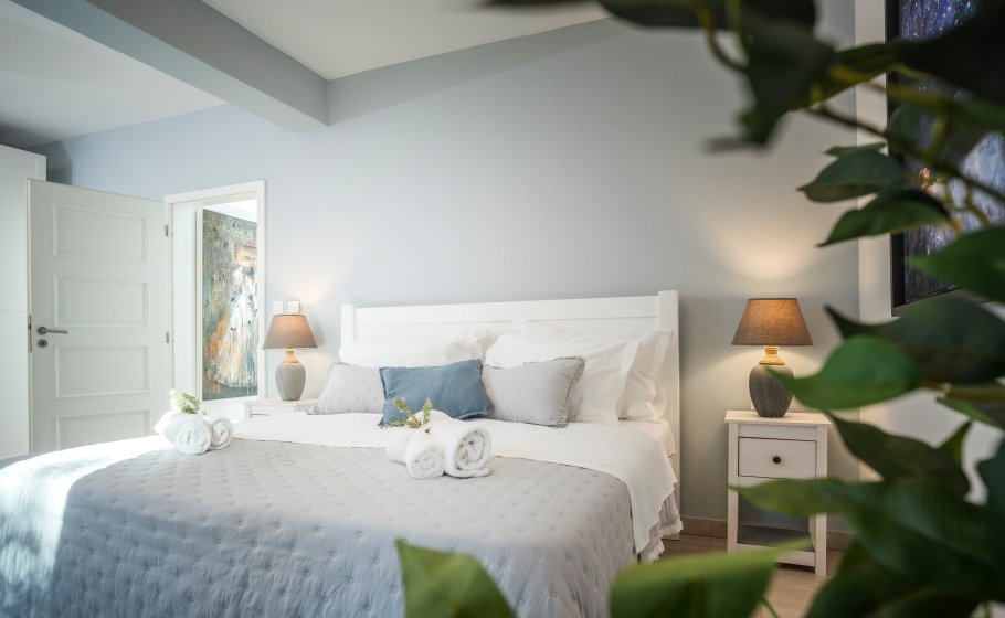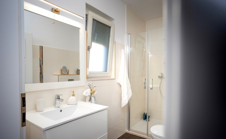 As soon as you open the door of Villa Iris, you’ll find yourself in the entrance hallway. To the right is a small toilet, and across from it is the first bedroom, 23m² in size, with a 4m² bathroom. This room has a matrimonial bed (180x200), and the bathroom has a shower tray.