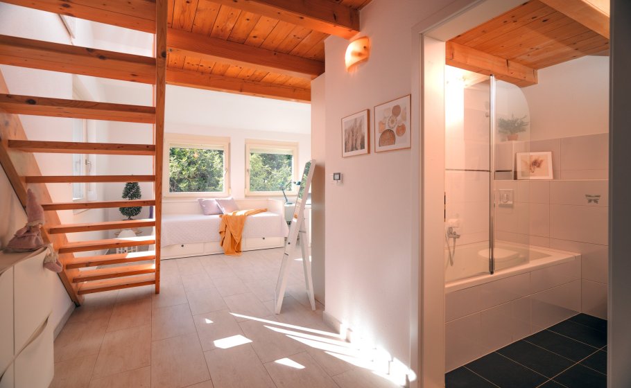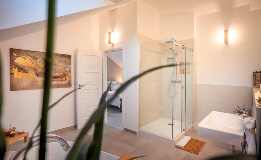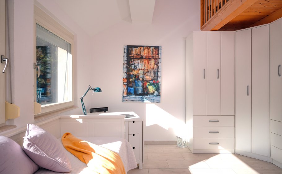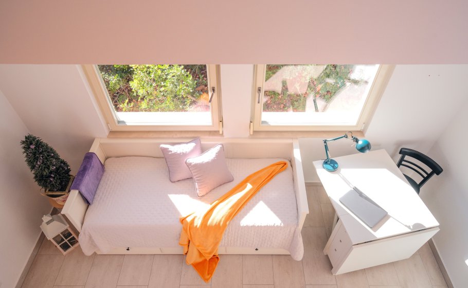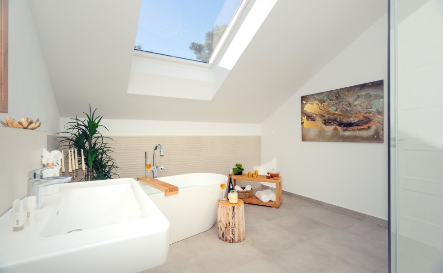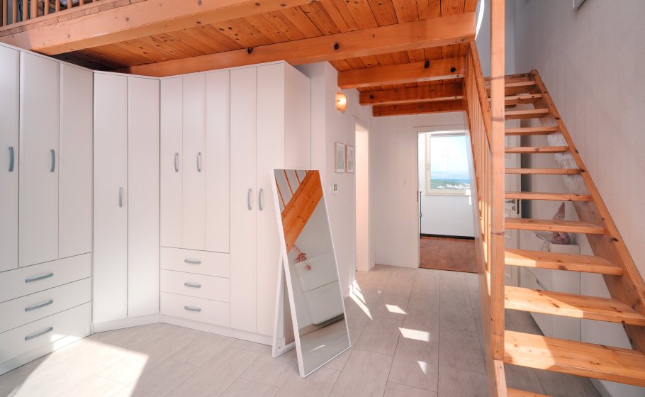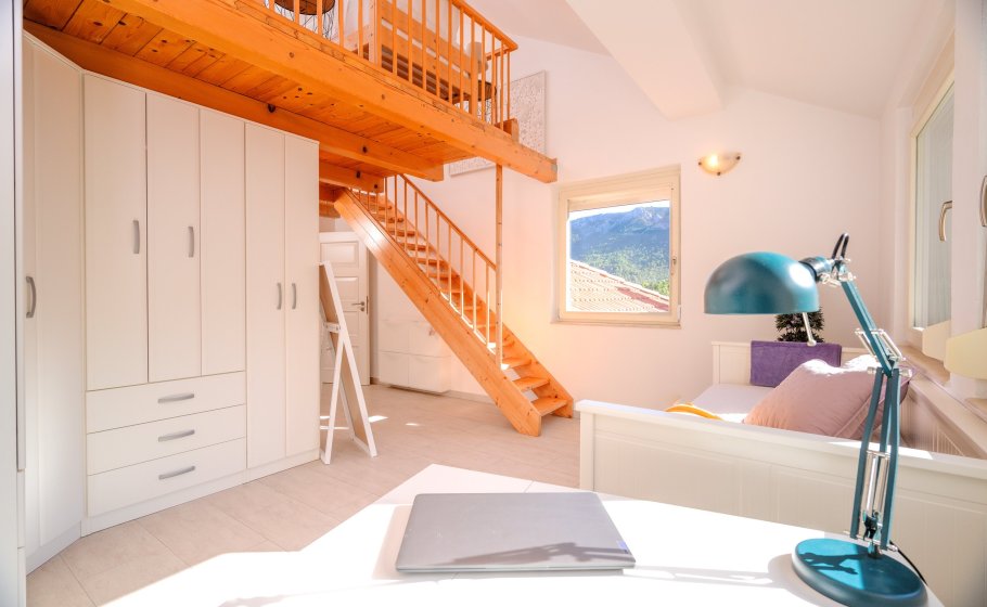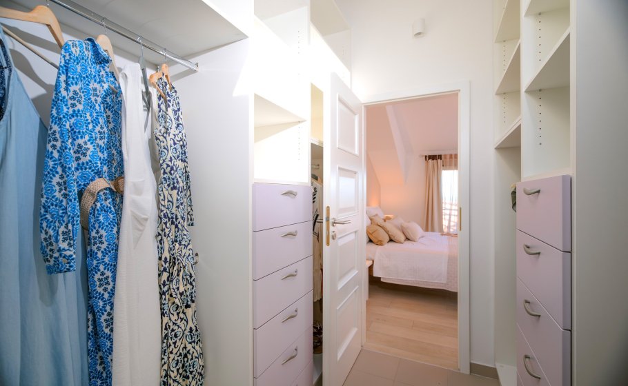 From the mezzanine level, stairs lead up to the top and final floor, the attic. Here you’ll find the master bedroom, 20m² in size, with a 6m² balcony (offering another beautiful view), a 15m² bathroom, and a 7m² walk-in closet. This bedroom features a matrimonial bed (180x200). The bathroom has a freestanding bathtub and a shower tray.
