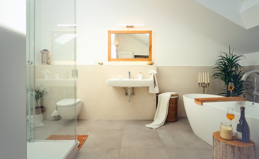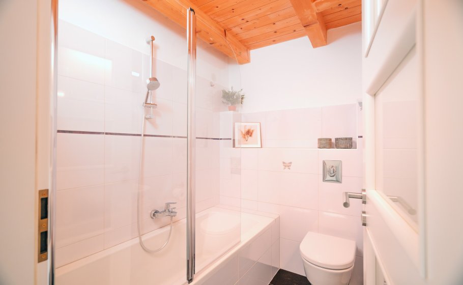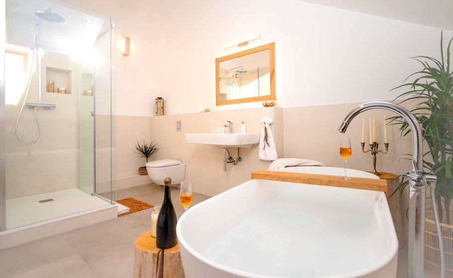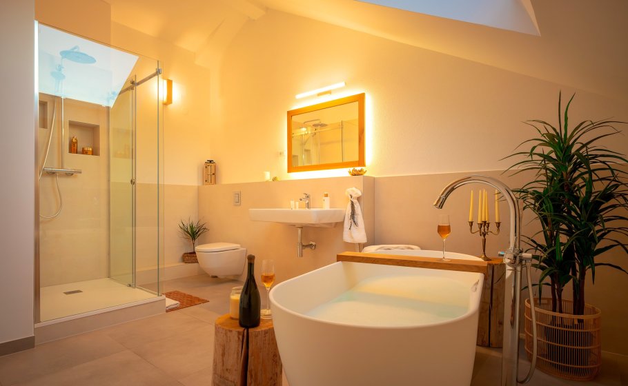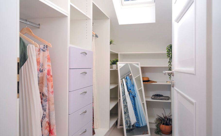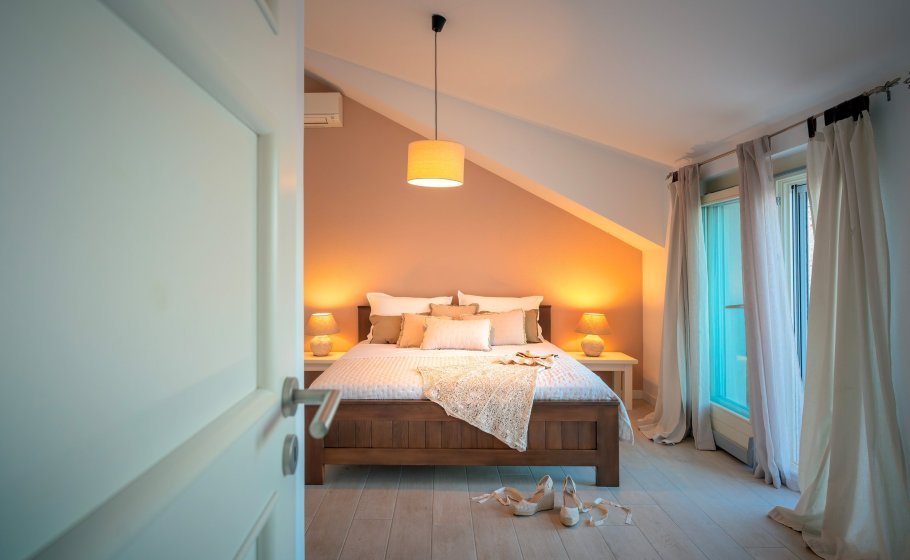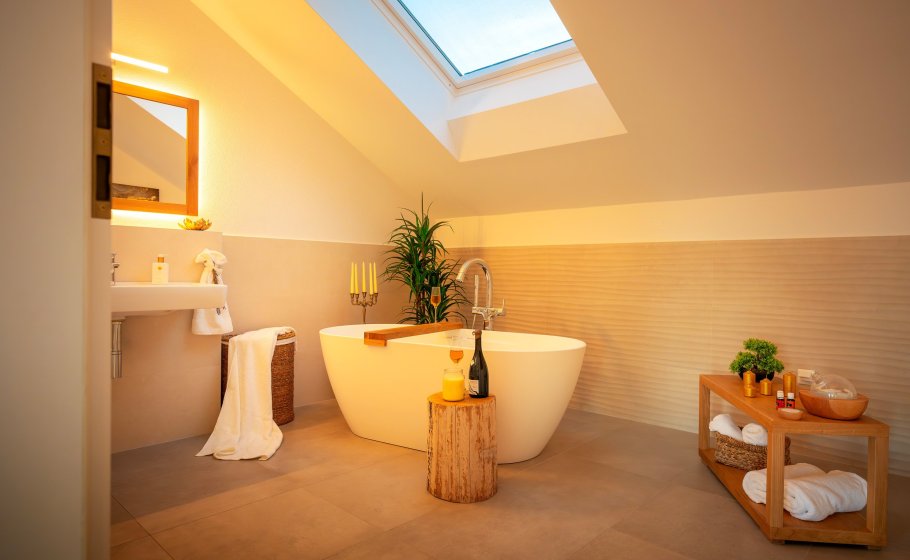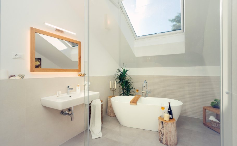 From the mezzanine level, stairs lead up to the top and final floor, the attic. Here you’ll find the master bedroom, 20m² in size, with a 6m² balcony (offering another beautiful view), a 15m² bathroom, and a 7m² walk-in closet. This bedroom features a matrimonial bed (180x200). The bathroom has a freestanding bathtub and a shower tray.
