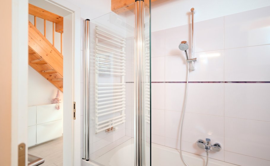 From the entrance hallway, stairs lead to a mezzanine level, where there is a bedroom with a gallery and a bathroom. The room is 20m² with a bed measuring 80x200 (extendable to 160x200), and the gallery is 13m², containing two beds of 90x200. The bathroom is 4.5m² and has a bathtub. This entire area is primarily designed for children but can also work for adults.