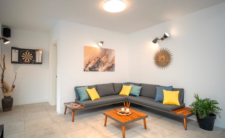 Returning to the kitchen level, stairs lead down to the lower floor, where you’ll find a 13m² massage room and a 14m² bedroom with access to a terrace (a small, beautiful courtyard) measuring 6m². This bedroom has a matrimonial bed (180x200). There is also a separate 5m² bathroom with a shower tray and a 7m² hallway. From here, stairs lead to a 24m² chill room featuring another small kitchen, a large sofa, a TV, darts, a stereo, a 4m² bathroom with a shower, and access to the terrace with the pool.