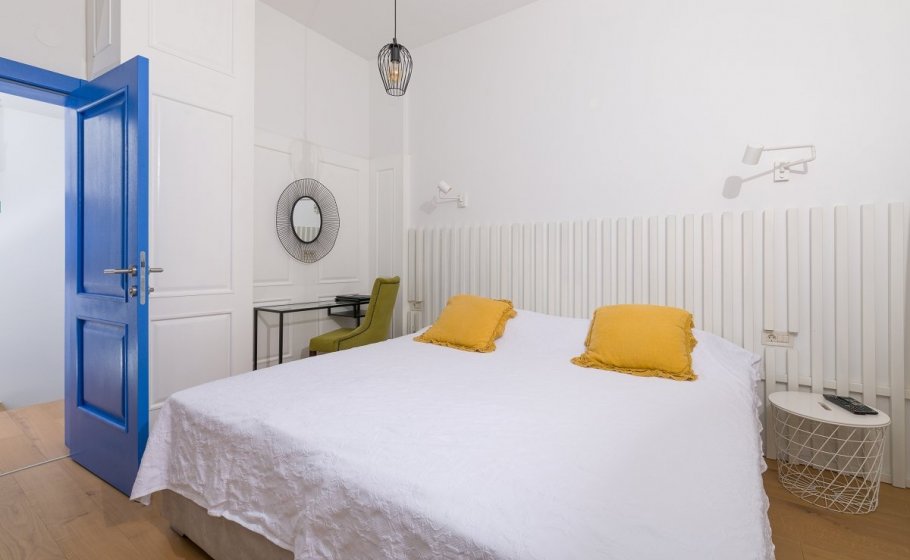 The first bedroom has a double king size bed (200cm x 210cm) and an additional sofa that can be changed to double bed size (180cm x 200cm), if needed. There is also a TV satellite set, a security deposit box, a wardrobe, AC, and most importantly – a sea view.