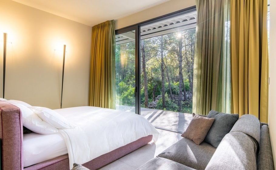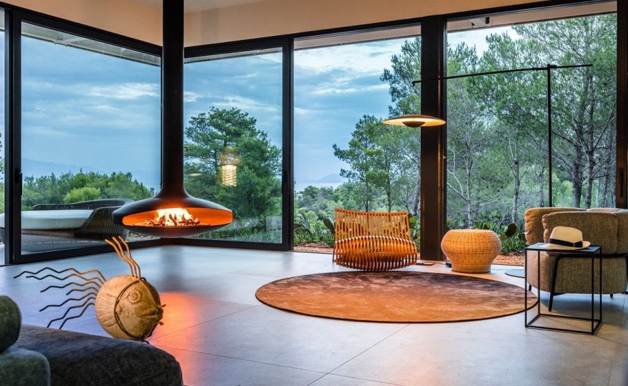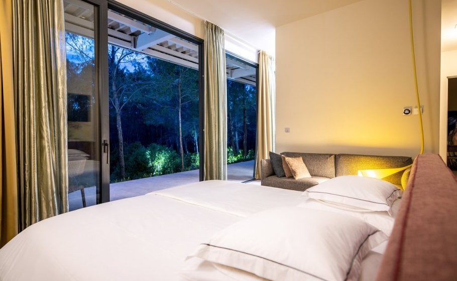 Nestled amidst breath-taking surroundings, villa Phaunos, the tree glass house, offers a truly immersive experience. Situated in the middle of a vast property of 10.000m2, you'll be treated 24/7 to stunning views of the natural landscapes that surround you. The first thing we saw when we went to check villa Phaunos was a beautiful bird just sitting on the tree across the living room, enjoying nature. It seemed like we were in the middle of David Attenborough’s documentary, and it was an unforgettable and a very gentle moment.