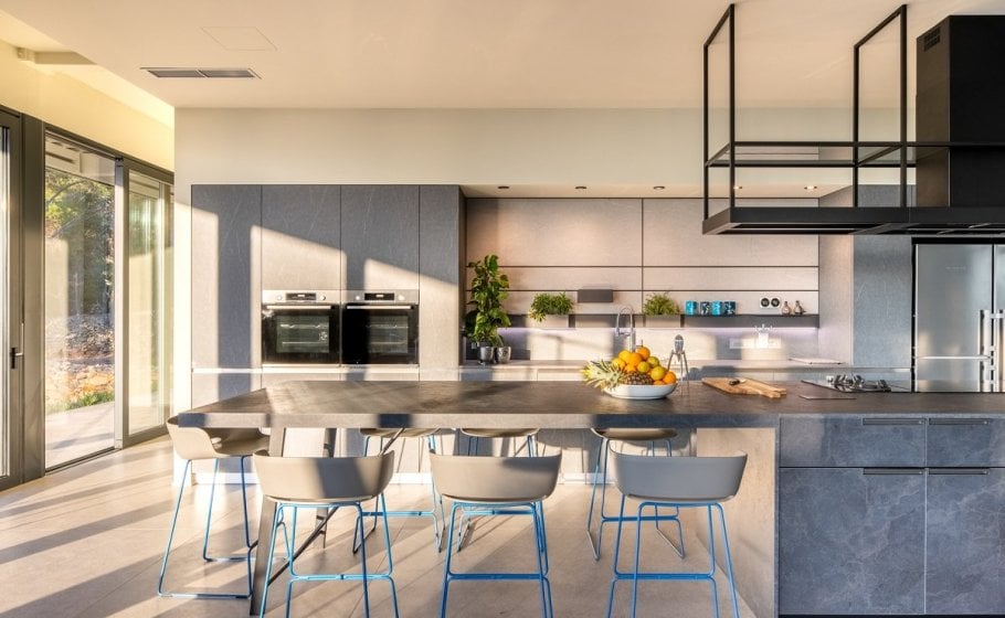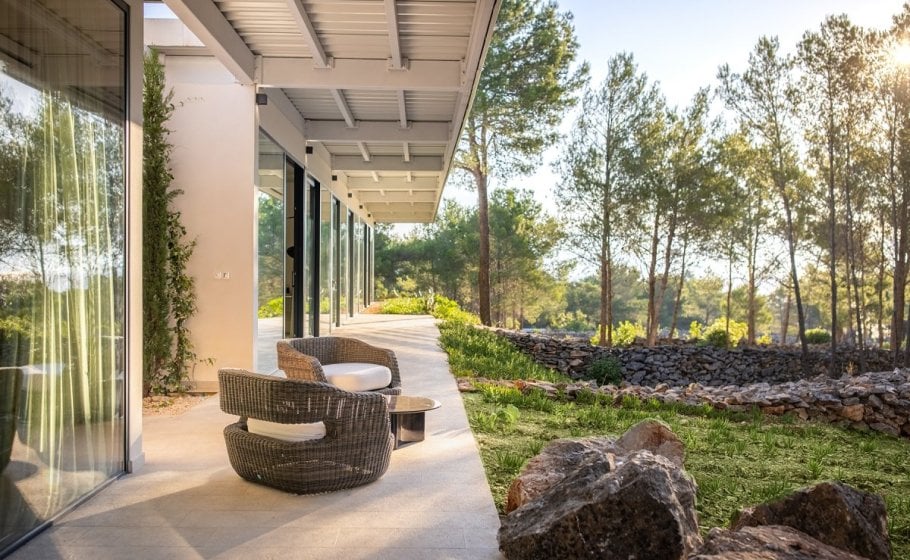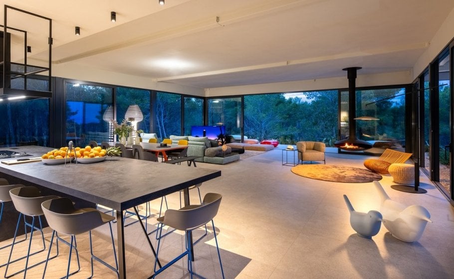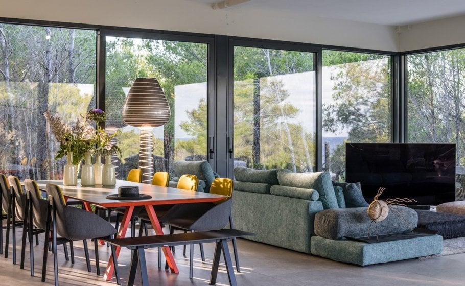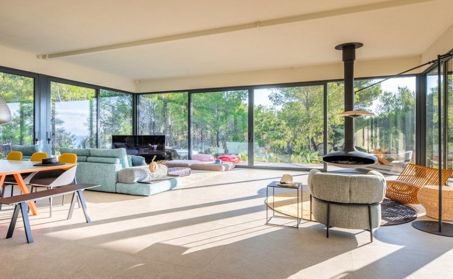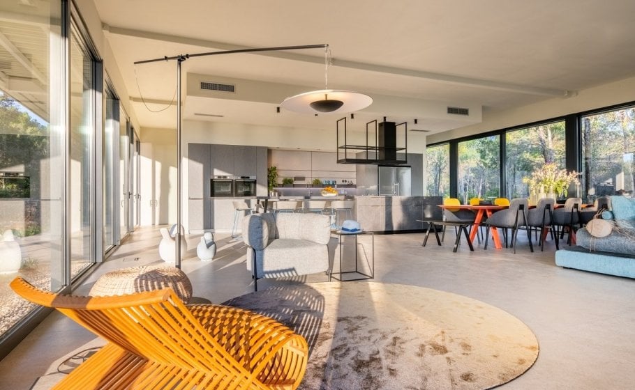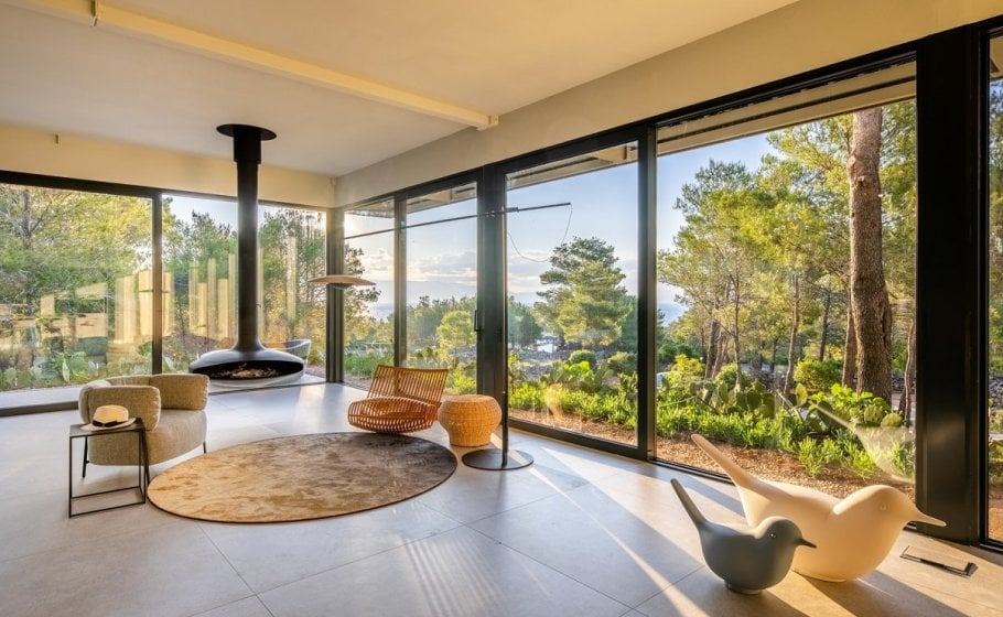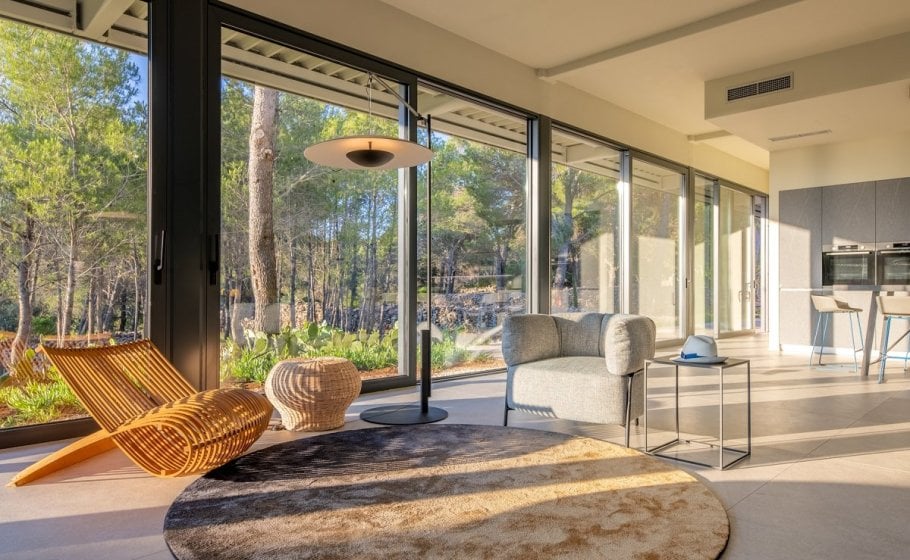 The stylish and comfortable living room beckons you to unwind and relax. A grand table for 14 people awaits, creating the ideal space for shared meals and engaging conversations while enjoying the view of different Mediterranean plants and pine trees that surrounds the villa.