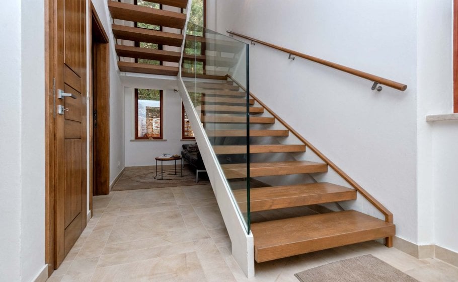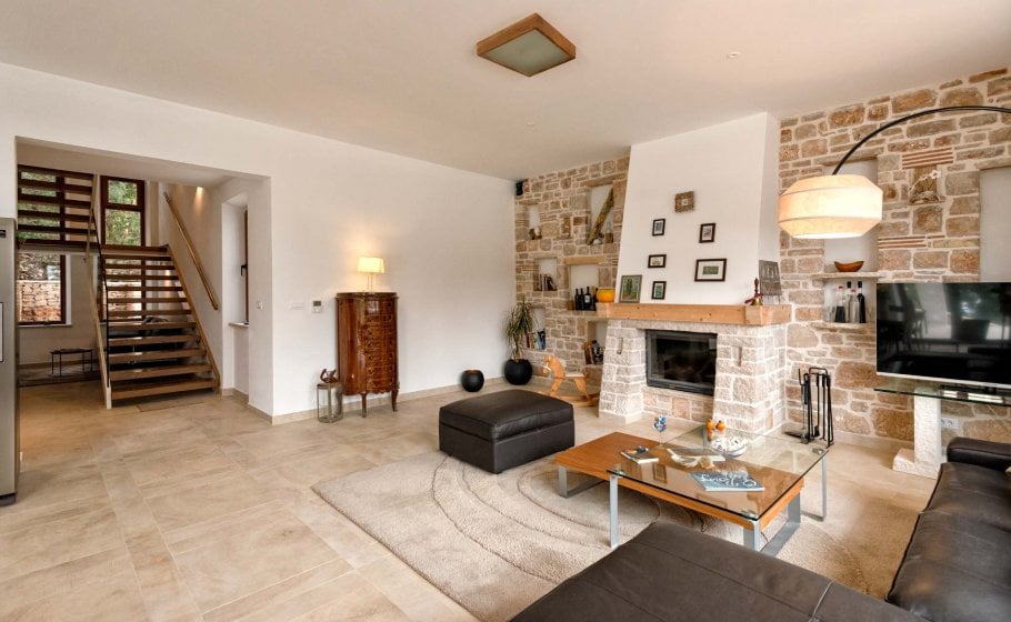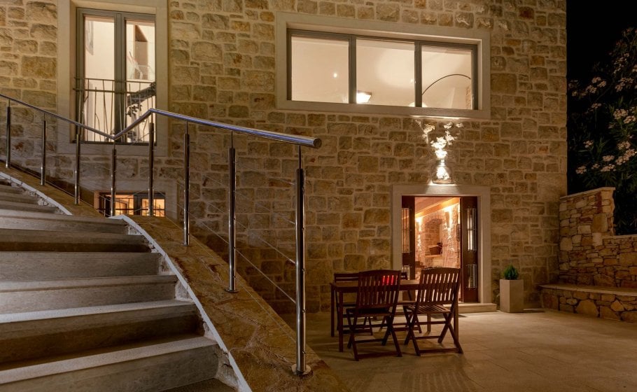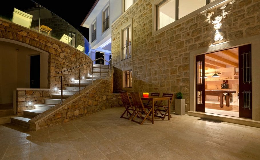 The entire veranda (and the rest of the house) is covered in stone, a blend of rustic Mediterranean and modern textures. What dominates the interior design is the warmth of the quality hand-processed massive oak in combination with designer furniture and various details plus glass railings and stone walls.
