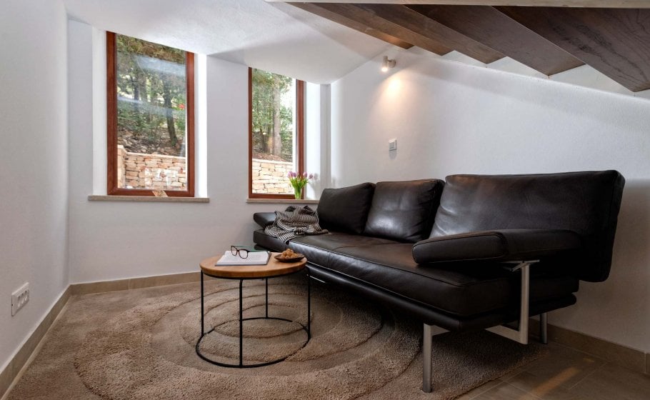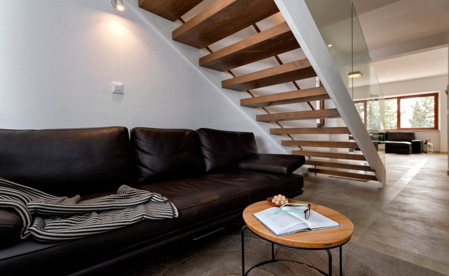 While you’re lying comfortably on the couch, you’ll discover a sweet surprise peeking from the living room: through the floating staircase, you’ll get a glimpse of two high, narrow windows, and beneath them another designer couch (that can turn into a bed if necessary), which makes it a perfect reading corner or an afternoon siesta spot.