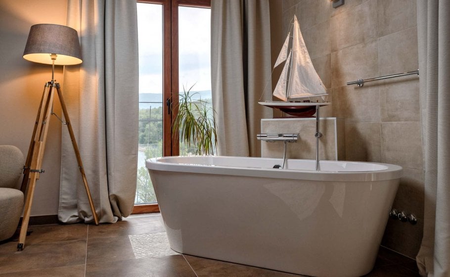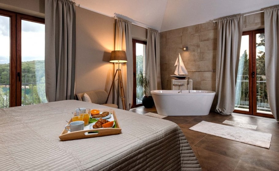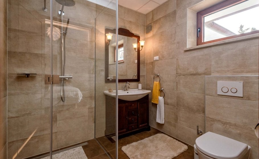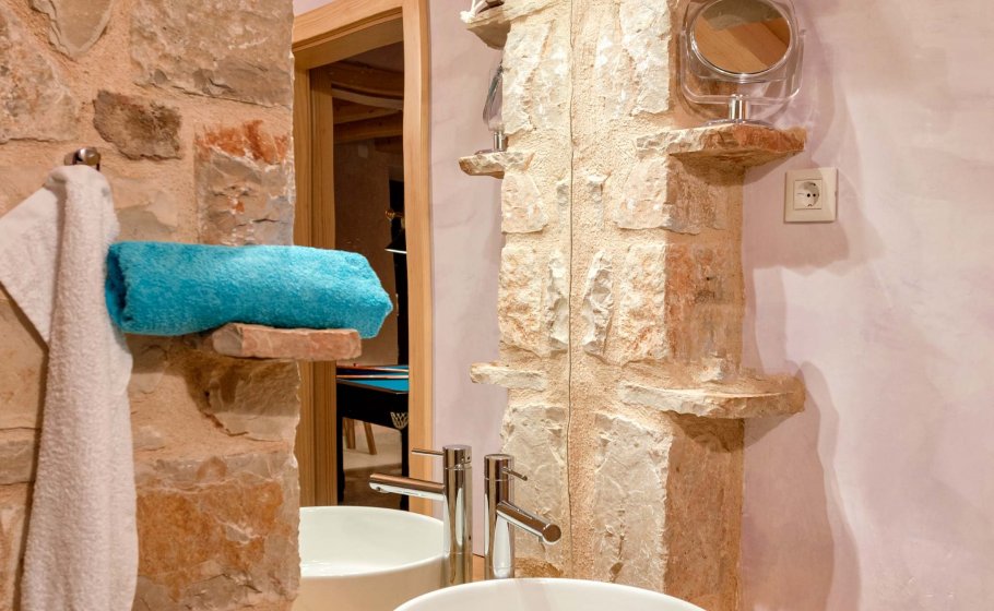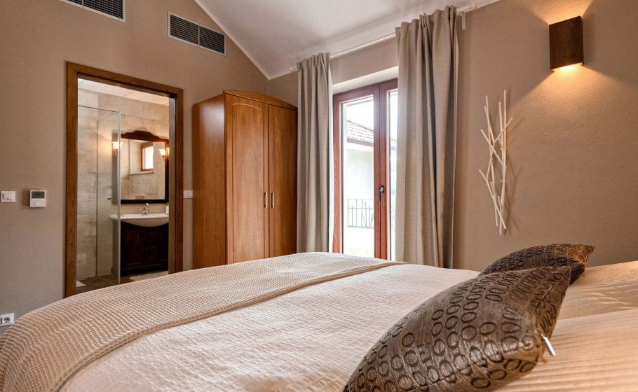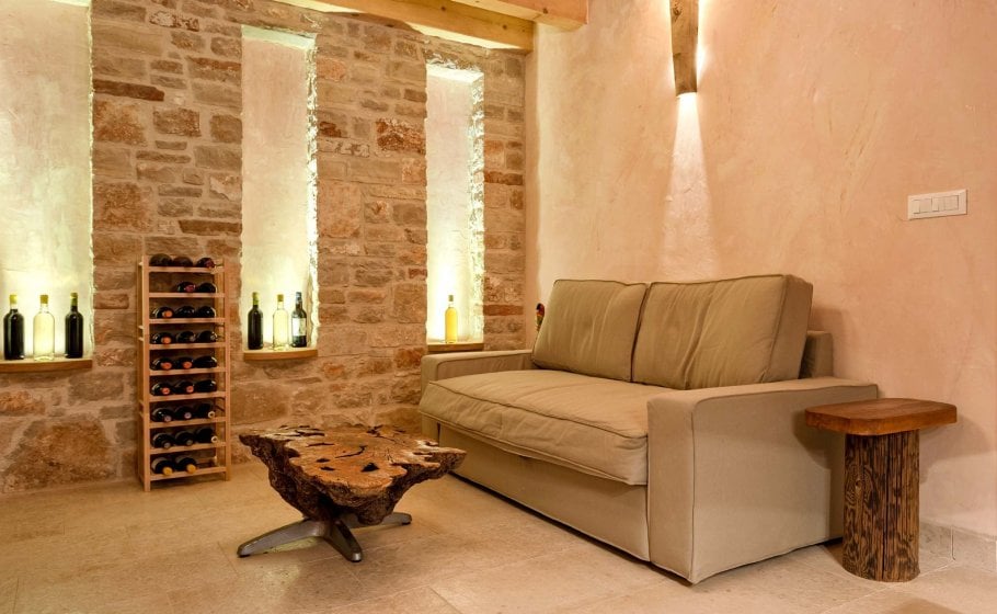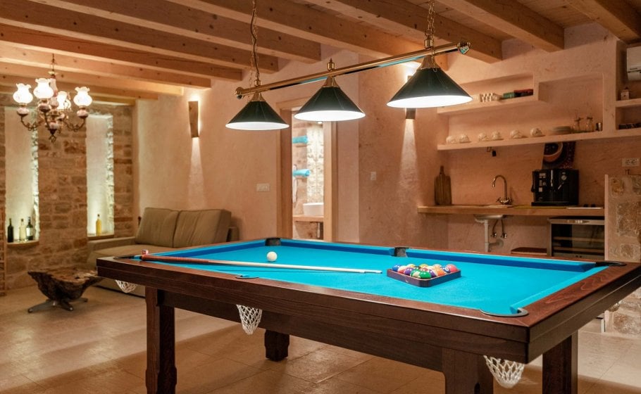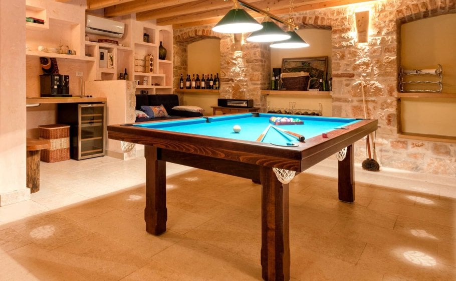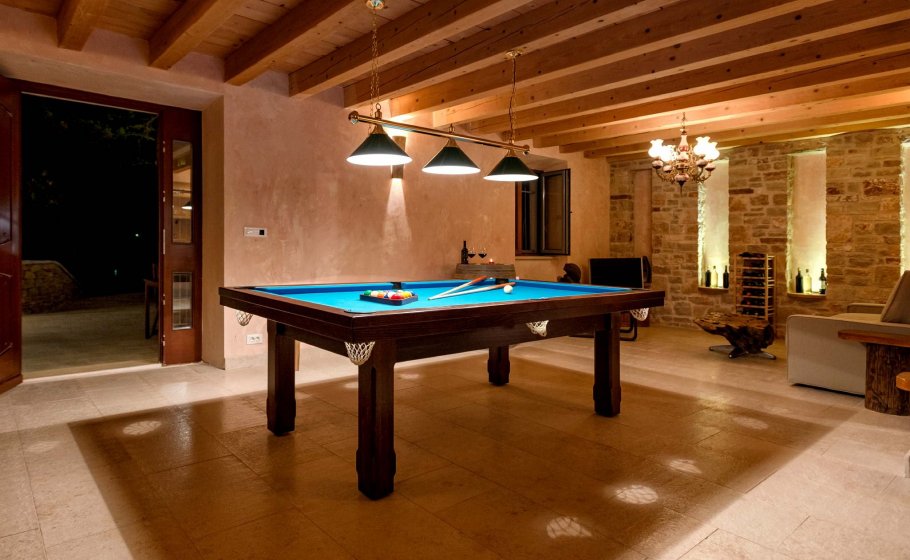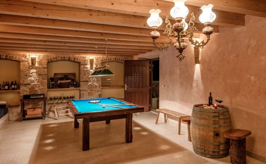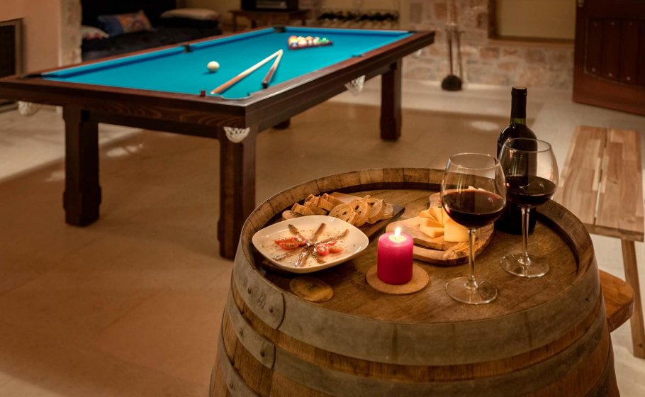 At the end, we reach the romantic wine cellar with a rich offer of exquisite wines. A large mahogany table is well-suited for enjoying food, but you’re a simple alteration away from enjoying a round of billiards there with your friends. There’s also a mini kitchen there. Most importantly, there is a couch that can turn into a bed for two if necessary and a bathroom with a shower tray – we recommend this part of the villa to those who prefer privacy and intimacy within a group.
