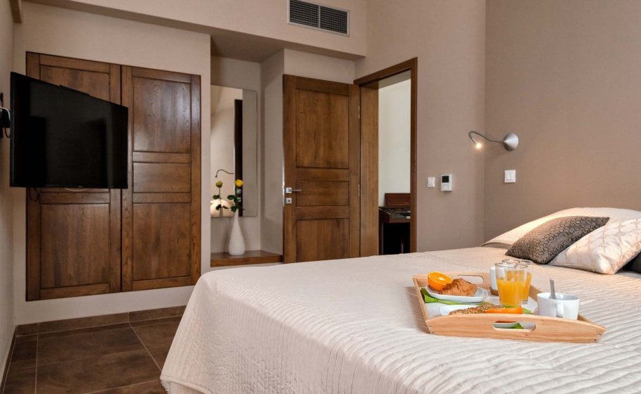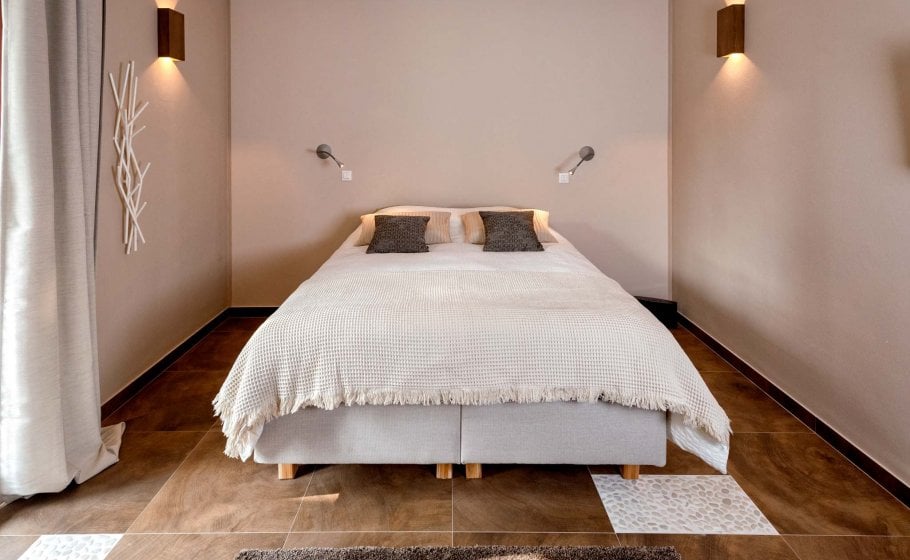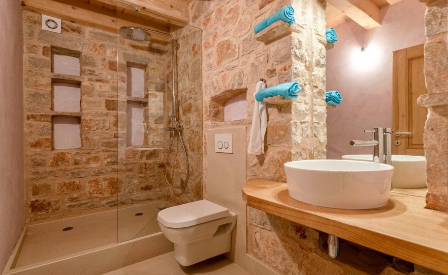 There are three double bedrooms with en-suite bathrooms on the upper floor. To the right of the gallery, you’ll see the entrance to the northern room, which has its own balcony, an en-suite bathroom with a shower tray, and a matrimonial bed (200x160 cm). Moving straight from the gallery and turning left, you’ll reach the entrance to the second bedroom (21 m2), which also has its own balcony, a large double bed (180x200 cm), and a spacious bathroom with a large walk-in shower tray. Opposite this room, there is the master bedroom with a large double bed (180x200 cm again), and you’ll understand why it’s the main bedroom of the villa as soon as you enter: 35m2 of space for sleeping and enjoying offers everything you may desire. The bathroom is attached to the sleeping area, separated only with a curtain wall, and the focal point of the space is Poseidon’s favorite beauty – a freestanding bathtub. A large balcony and two French balconies offer copious amounts of light and views of the sea, and thick minimalist curtains (if you want intimacy) and the warm color of wood of the wardrobe or the standing lamp complete this gorgeous space and add personality to it.