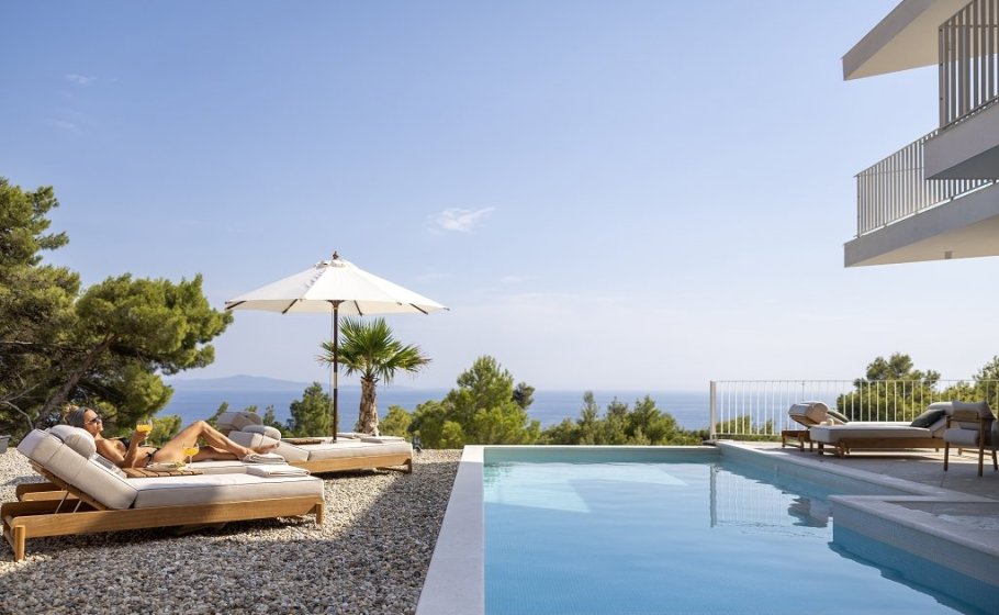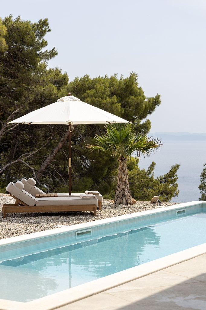 Not all ships sail, some just anchor in paradise . Perched on Hvar’s cliffs, this white villa leans toward Šćedro , the pool catches the sun, and the nearest beach (and fresh fish) is just a short stroll away . Decisions here are simple: swim, sip, repeat.