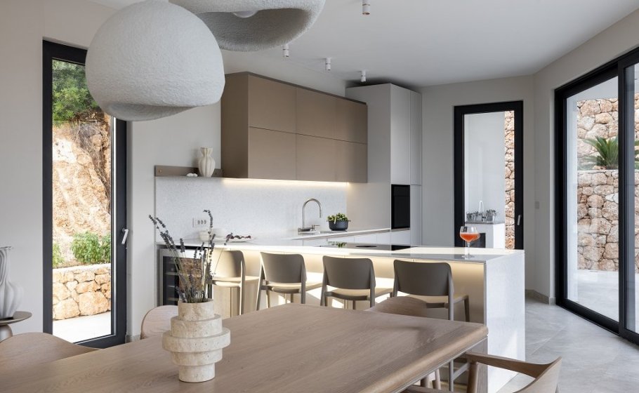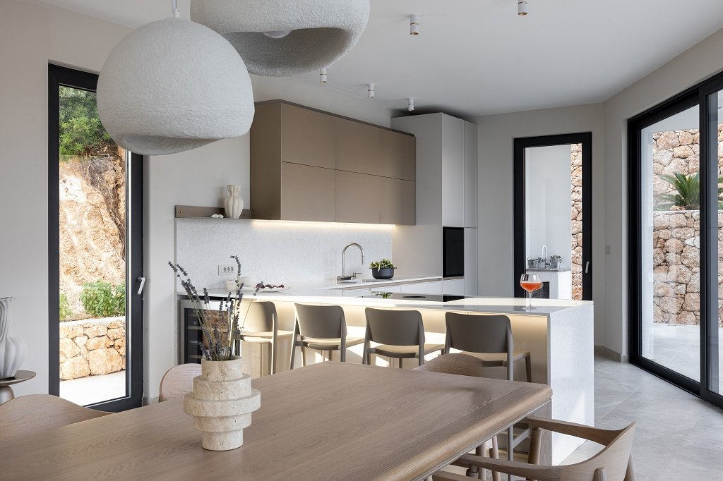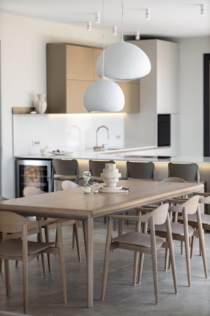 Inside, earthy tones, warm textures, and brass accents create a serene and inviting atmosphere. Carefully selected furnishings, from a solid oak dining table and linen sofas to sculptural Bang & Olufsen speakers, contribute to the elegant, understated luxury of the home.