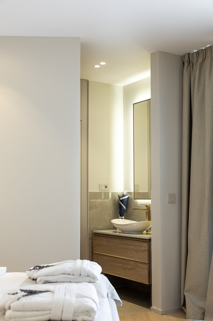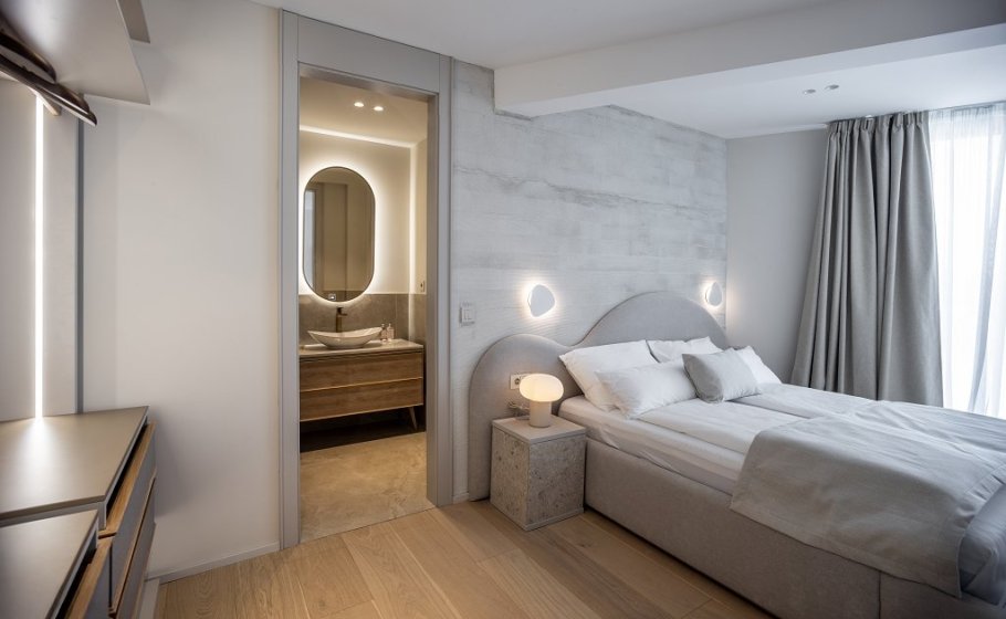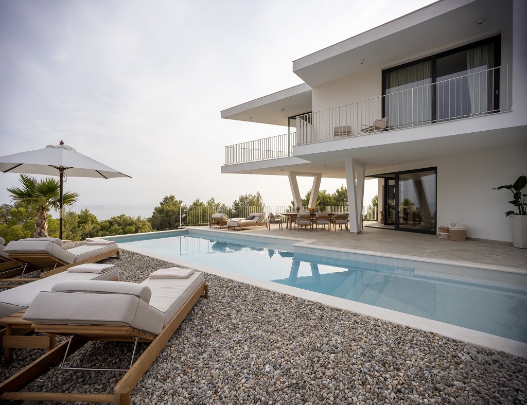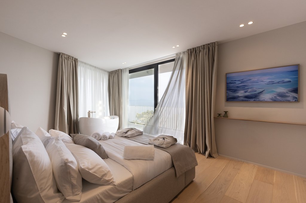 The ground floor opens into a bright, fluid living area with a modern kitchen, refined dining space, and a stylish lounge. Floor-to-ceiling glass doors blur the boundary between indoors and outdoors, filling the home with Mediterranean light and sea breeze. Upstairs, three spacious en-suite bedrooms each feature private balconies with panoramic views of the Adriatic and surrounding islands, while the master suite includes a freestanding bathtub and a slender cantilevered terrace, reminiscent of a ship’s bow gliding toward Šćedro.