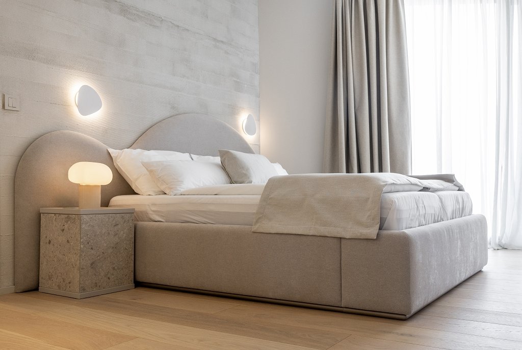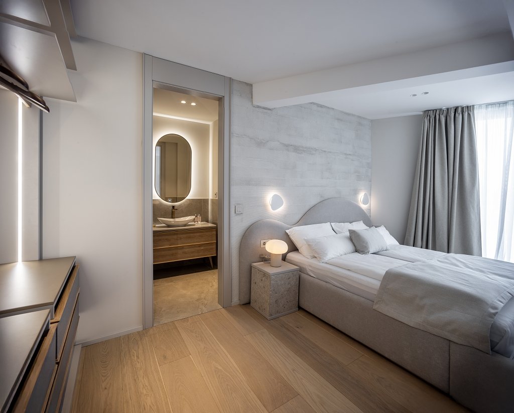 Designed by studio 25.4mm and winner of the BIG SEE Award 2025, the villa harmonises beautifully with its surroundings. Its white trapezoidal form contrasts with the turquoise infinity pool, while traditional dry-stone walls anchor it in Dalmatian heritage. The exterior spans approximately 300m², including a sun deck, lounge, barbecue, and a herb garden, offering both privacy and open-air luxury.