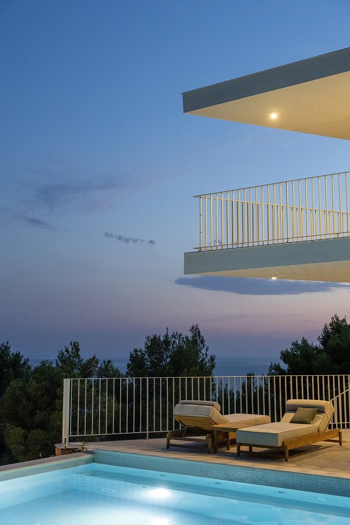 Resembling a white ship sailing toward Šćedro, this award-winning luxury villa rises from the dramatic landscape of pine forests, red cliffs, and the deep blue Adriatic in Sveta Nedjelja, Hvar. Completed in 2025, it is a striking blend of contemporary architecture and the raw beauty of Dalmatia.