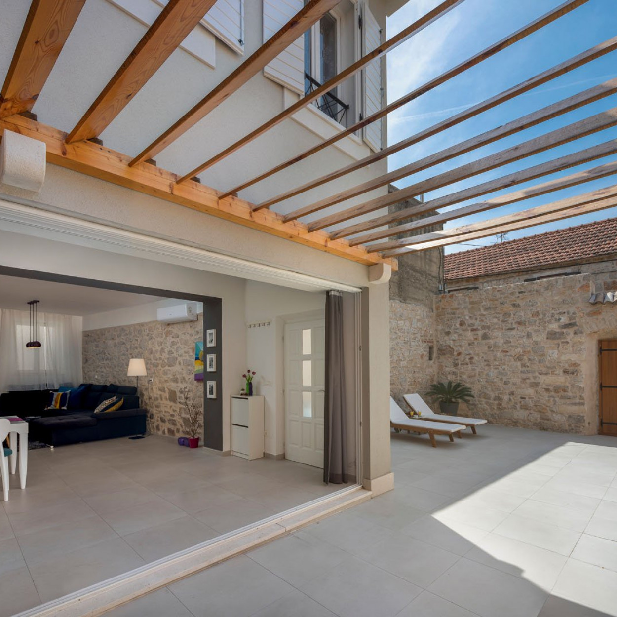 All beds have invaluable Bawaria Wolltex Premium mattresses, something we have to emphasize since the purpose of a vacation is to rest – and these mattresses will help you sleep like a baby. The rooms feel quite spacious and large since there is no ceiling – you can see wooden roof beams that give the space an additional whiff of warmth and charm. In case you decide to visit Jelsa in the winter – the upper-floor bathroom and the entire ground floor (kitchen, living room, bathroom) have floor heating. Each bedroom, living room, and kitchen have AC. The yard is equipped with everything you need for a pleasant afternoon siesta or an evening socializing.