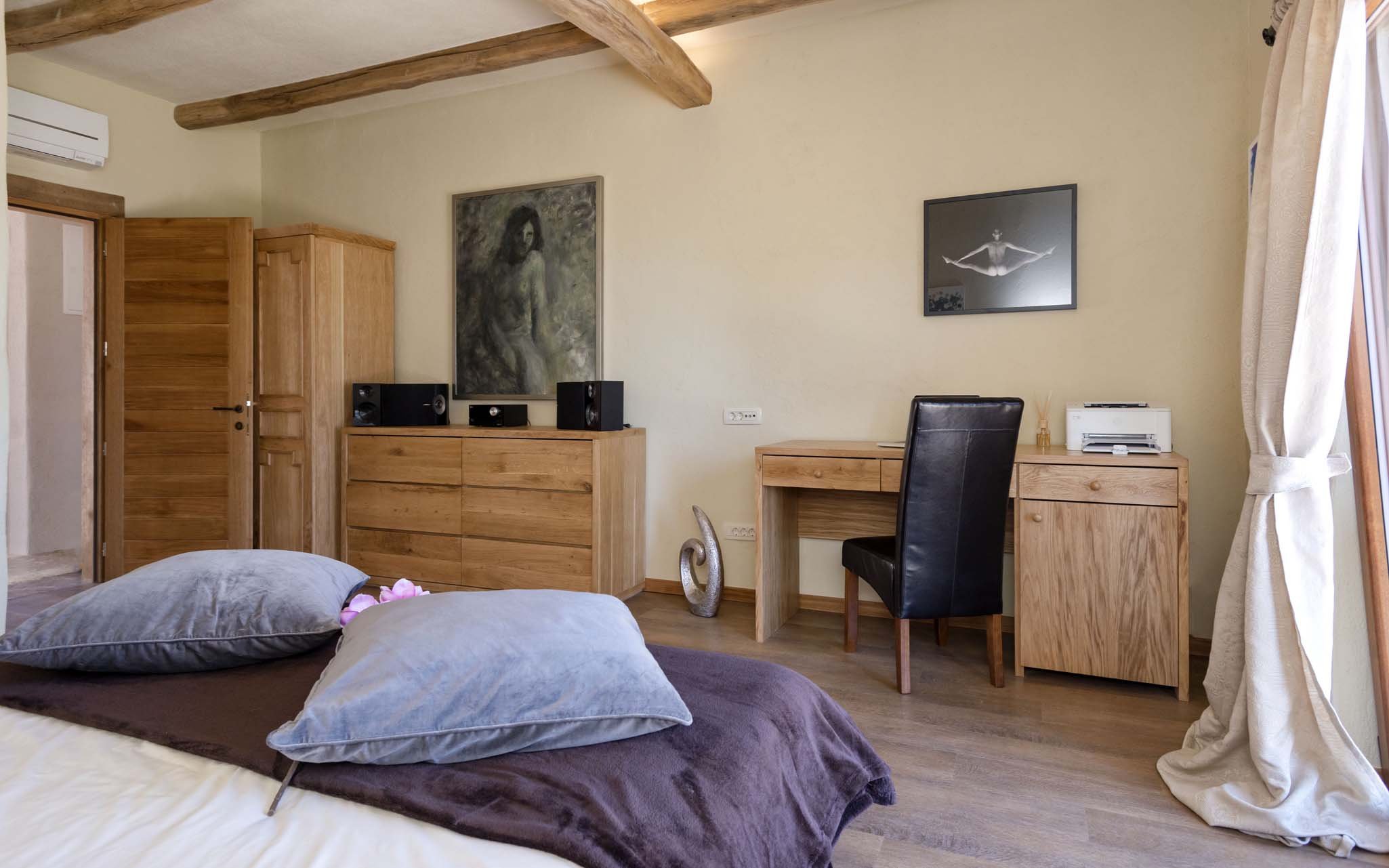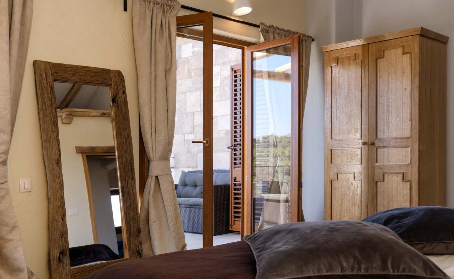 From the anteroom, the second doors on the right lead to a master bedroom with a double bed (180cm x 200cm), an en-suite bathroom with a shower tray, and a large balcony which you can see behind the glass balcony doors of the room. Because of the large glass door, both rooms are bright and airy despite of the abundance of wood and warm, brown color tones. What we especially like in the master bedroom is a specific Renaissance window that gives the room an additional romantic touch.