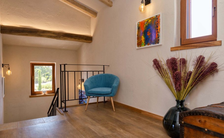 The upper floor is also specific because of the slopes of the ceiling and the wooden beams that make the room seem warmer and more intimate. The lower floor also has the same wooden beams.